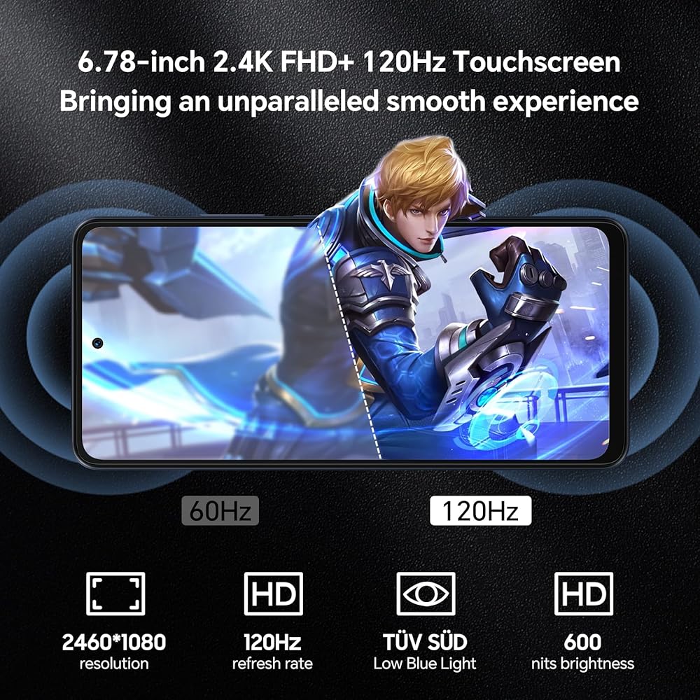 π±γ6.78-inch FHD+ screen at 120Hz γWider Screen, Bigger World. OSCAL Tiger12's incredibly lightweight design delivers a perfect 2.4K and 120Hz eye feast that surpasses the boundaries of your imagination. The high 120Hz gggiornament frequency allows your eyes to perceive movement on the screen more smoothly, it is perfect for graphic design or ultra responsive for racing games. All this is made possible by OSCAL Tiger12 cell phone.