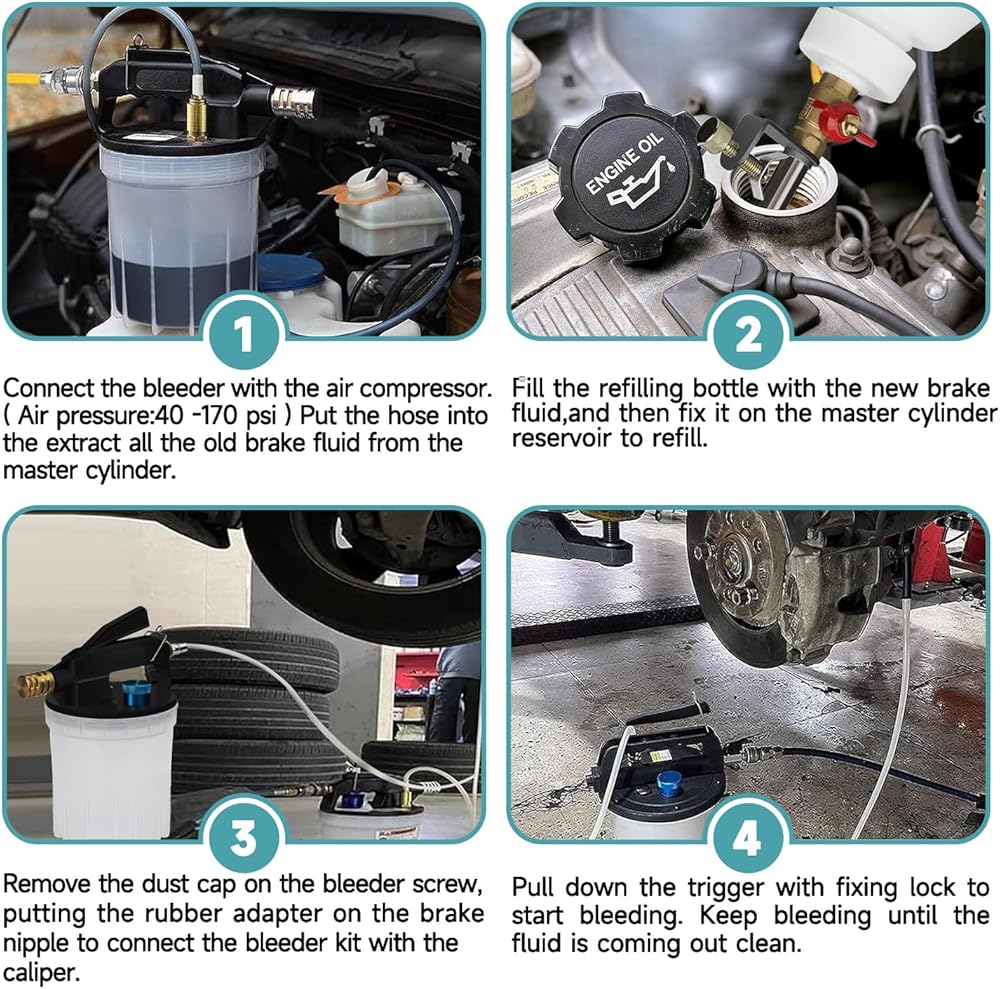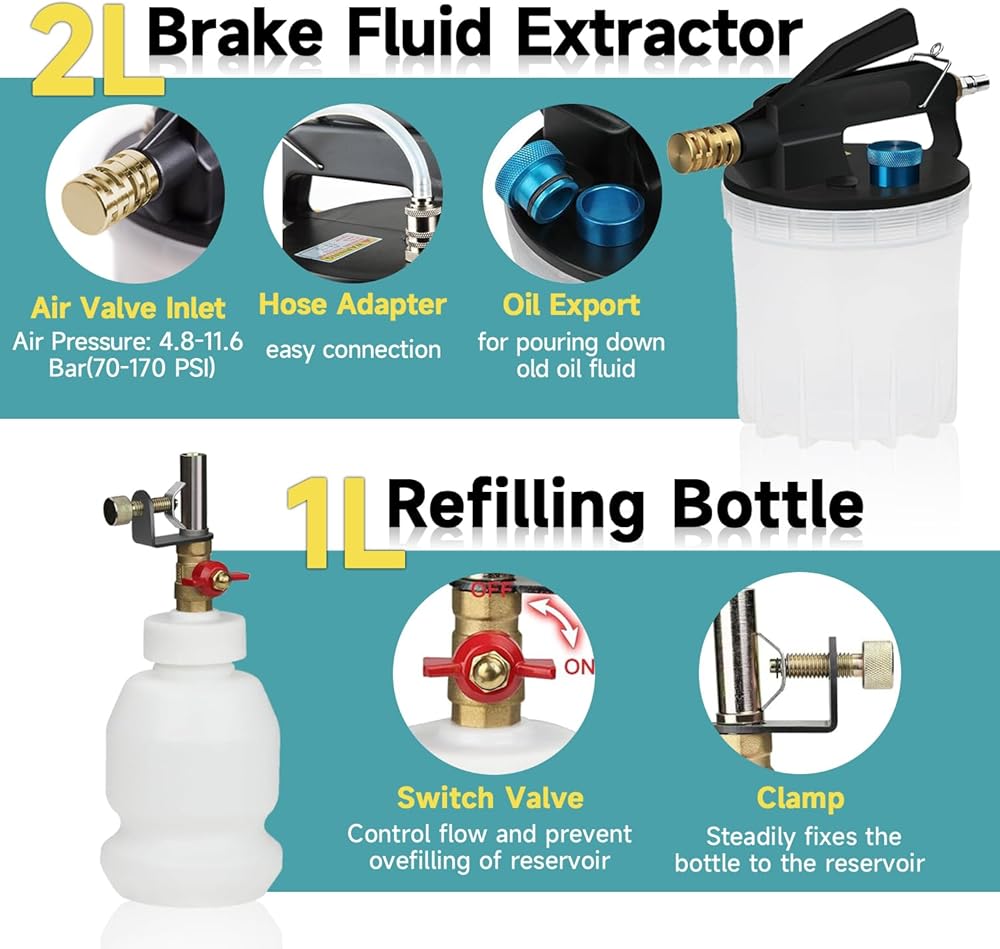 【Convenient design】: One-time filling is faster and more convenient. With 2L brake fluid extractor and 1L refilling bottle, the kit accommodates sufficient fluid capacity to handle various brake systems without constant refills.