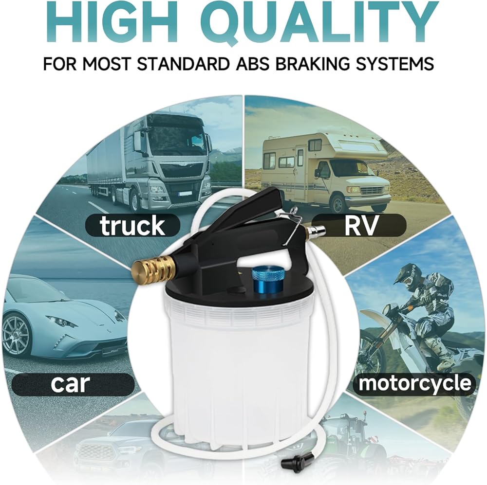 【You Will Get】2L Vacuum Brake Bleeder; 1L Refilling Bottle; 2pcs 40inch Silicon Hose; 2 Bleed Screw Adapters; 1 extension tubing. That used wiht most types of brake drain accessories, and for most standard and ABS brake systems on cars.