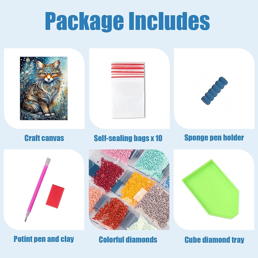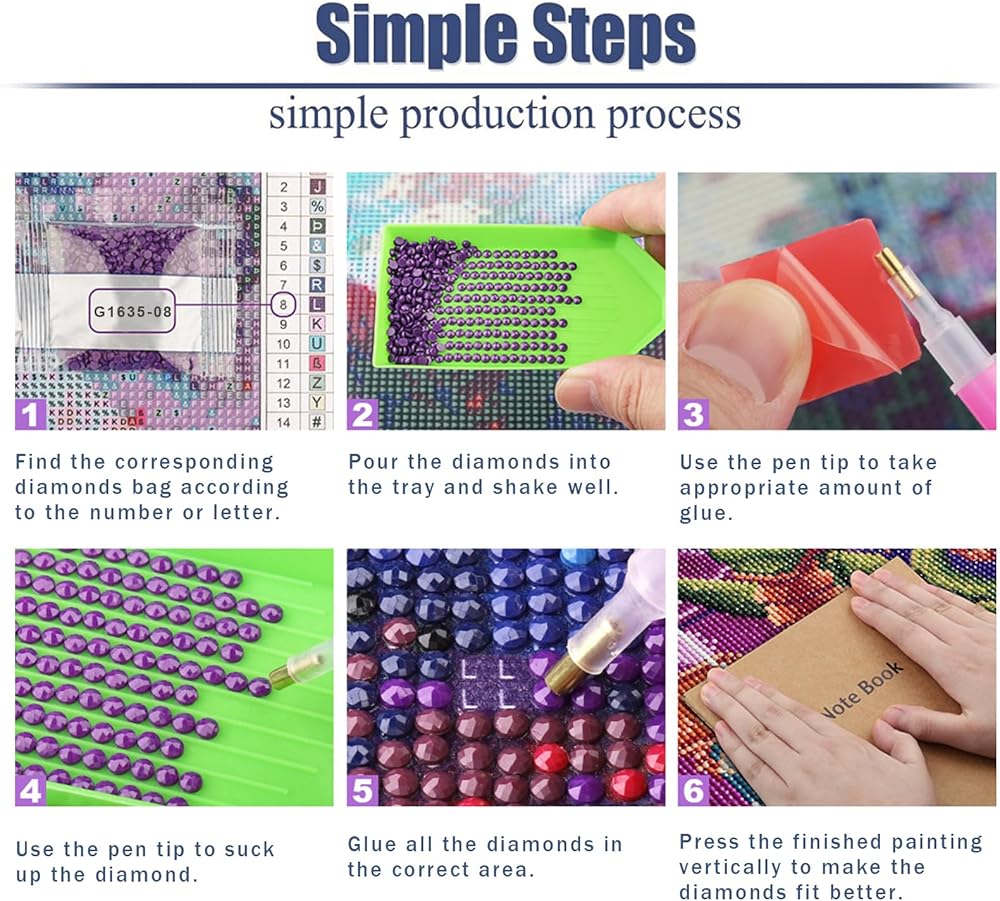 【WHAT YOU WILL GET】1x High definition painting canvas; 1 x Color Coded Rhinestones; 1 x Point Diamond Pen; 1 x Craft Tray; 1 x Clay; 4 x self-sealing bags. There are 30% excess drill beads in each section, definitely no worry of running out or not having enough