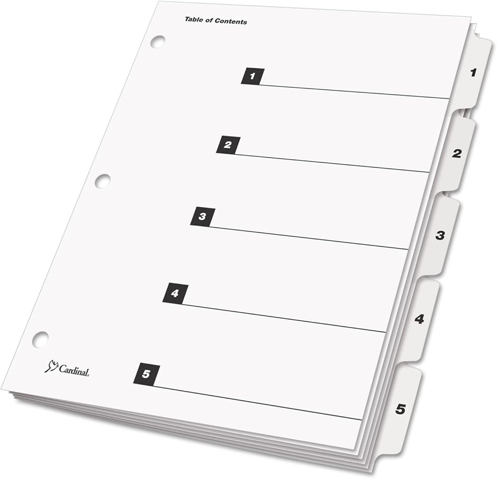 Cardinal One Step Index Dividers help you create custom index sets with a bright white customizable table of contents and 5 matching numeric binder dividers Makes a stunning presentation in minutes Customize your printable binder index on any standard laser or inkjet printer These tab dividers have two-way preprinted tabs that are reversible for vertical or horizontal display Create a quick and easy school binder for the semester start a recipe binder organize and store user manuals arrange sheet music binders by composer and more Easy to use FREE online binder templates let you print a new table of contents page or binder covers and spines Three-hole punched for standard 8-1/2" x 11" notebooks 1/5-Cut dividers for 3 ring binder planning numbered tabs 1–5 White 1 Set