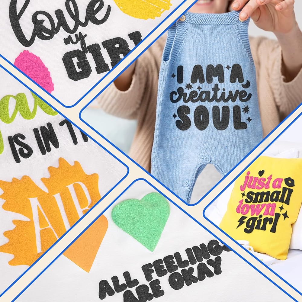 PERFECT CHOICE FOR DIY PROJECTS. Add more color and creativity to your DIY projects with our 10" x 60" adhesive HTV in various beautiful colors. With this heat transfer vinyl, you can easily customize it to be something personal that they will love, and perfectly provide stunning 3D puff effects that are sure to make your designs pop. Our htv vinyl is 100% eco-friendly material for all cutting machines.