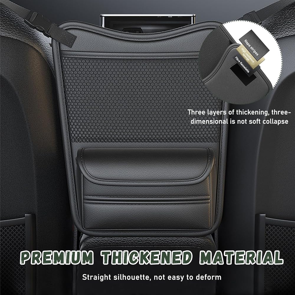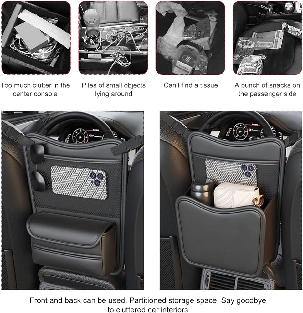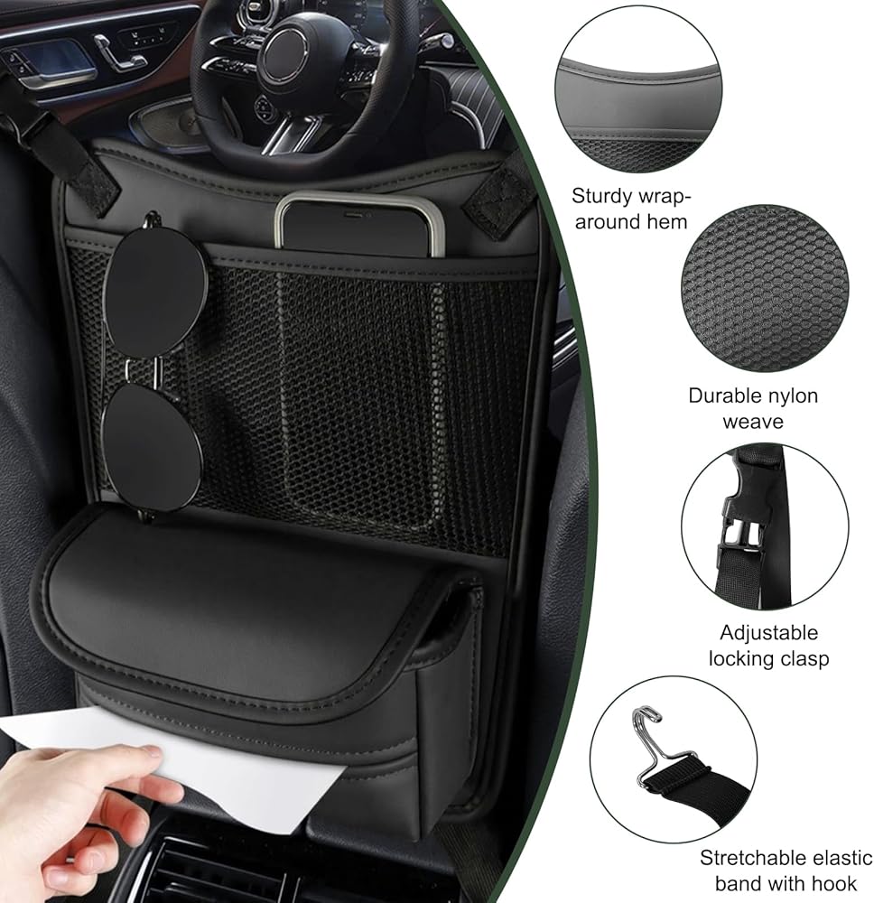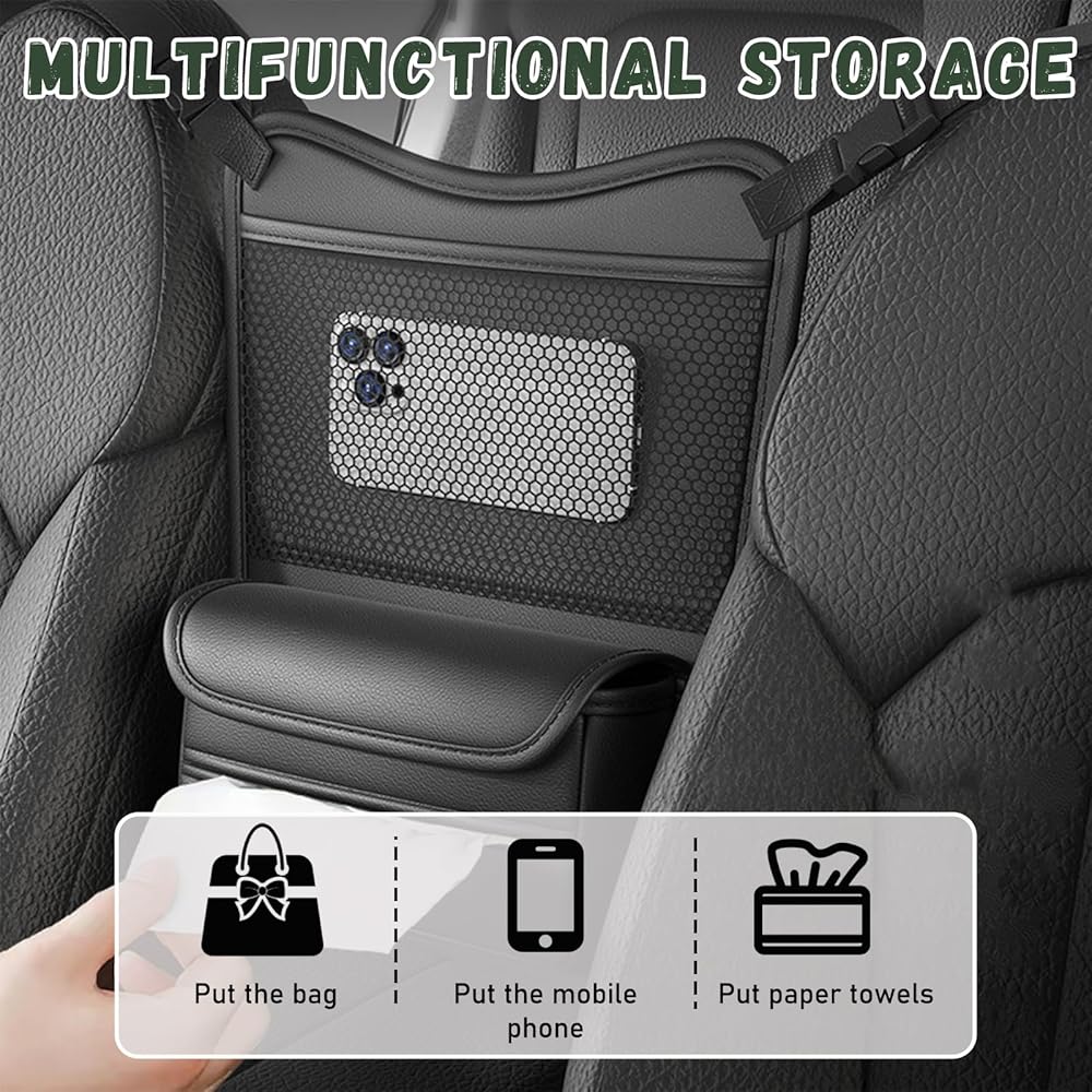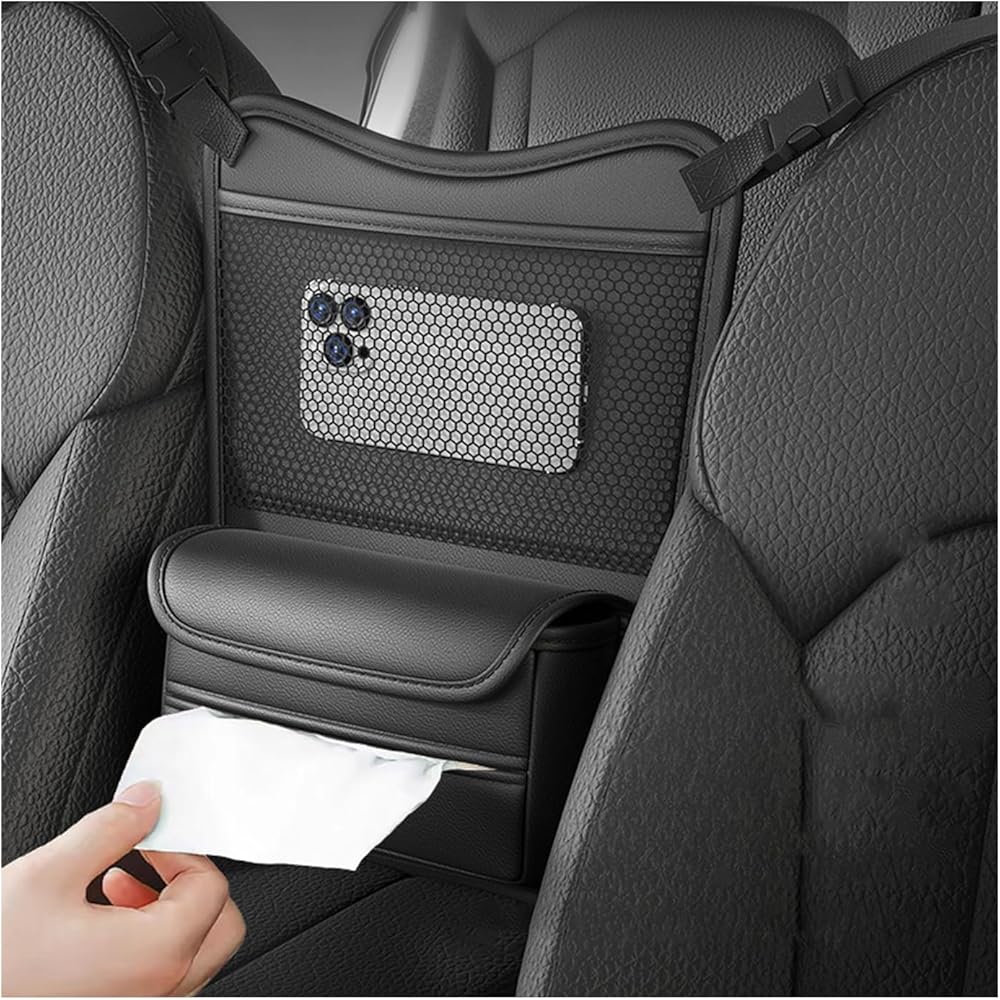 【Clear & Convenient】: The storage bag has a layer of mesh pocket that allow you to clearly see the items placed inside. The open tissue storage box allows you to easily take out tissues. The adhesive design also makes paper towel replacement easier. The most important is that it's right between the two seats, so everything inside is within easy reach.
