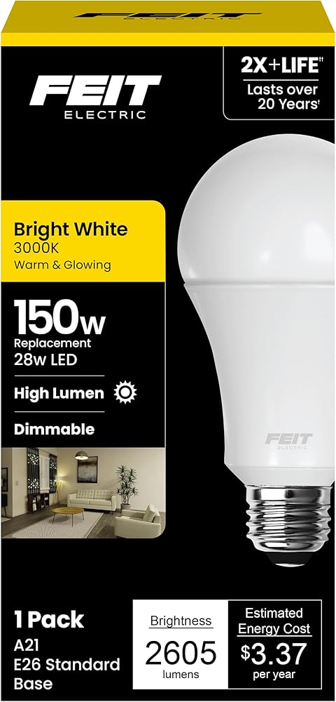 Enjoy all the benefits of advanced LED energy-saving technology with the Feit Electric OM200/850/LED high-lumen LED light bulb. This 5000K Daylight bulb produces 3050 lumens while using only 25 watts - up to 87% less energy than an equivalent 200 watt incandescent light bulb. Feit Electric A21 bulbs have an average life of 25, 000 hours / 23 years, are RoHS compliant and 100% mercury free. Choose a dependable high-lumen bulb for your residential or commercial applications. This bulb is California Energy Commission (CEC) certified. Specifications: Color temperature: 5000K Brightness: 3050 Lumens Watt equivalent: 200 Watts Watt: 25 Watts Dimmable: No CEC Certified: Yes Life Hours: 25, 000 Feit is a leader in first to market lighting innovations and driven to deliver the latest breakthrough in interior and exterior illumination. To us, lighting is everything. Feit Electric bulbs can turn a house into a home, make an unsafe area feel more secure, and navigating your way back to bed a lot easier. Our LED product portfolio includes a full line of energy efficient LED bulbs, retrofit kits and Feit string lights. Feit Electric also manufactures energy-efficient LED luminaires including ultra-slim edge-lit ceiling fixtures, light-weight utility shop lights, and weatherproof outdoor LED fixtures. Family owned. Family operated. Based in Los Angeles, California since 1978. We are devoted to our long-time employees, customers, and retail partners – together, we all prosper. See more of our Feit family of products on our Storefront.
