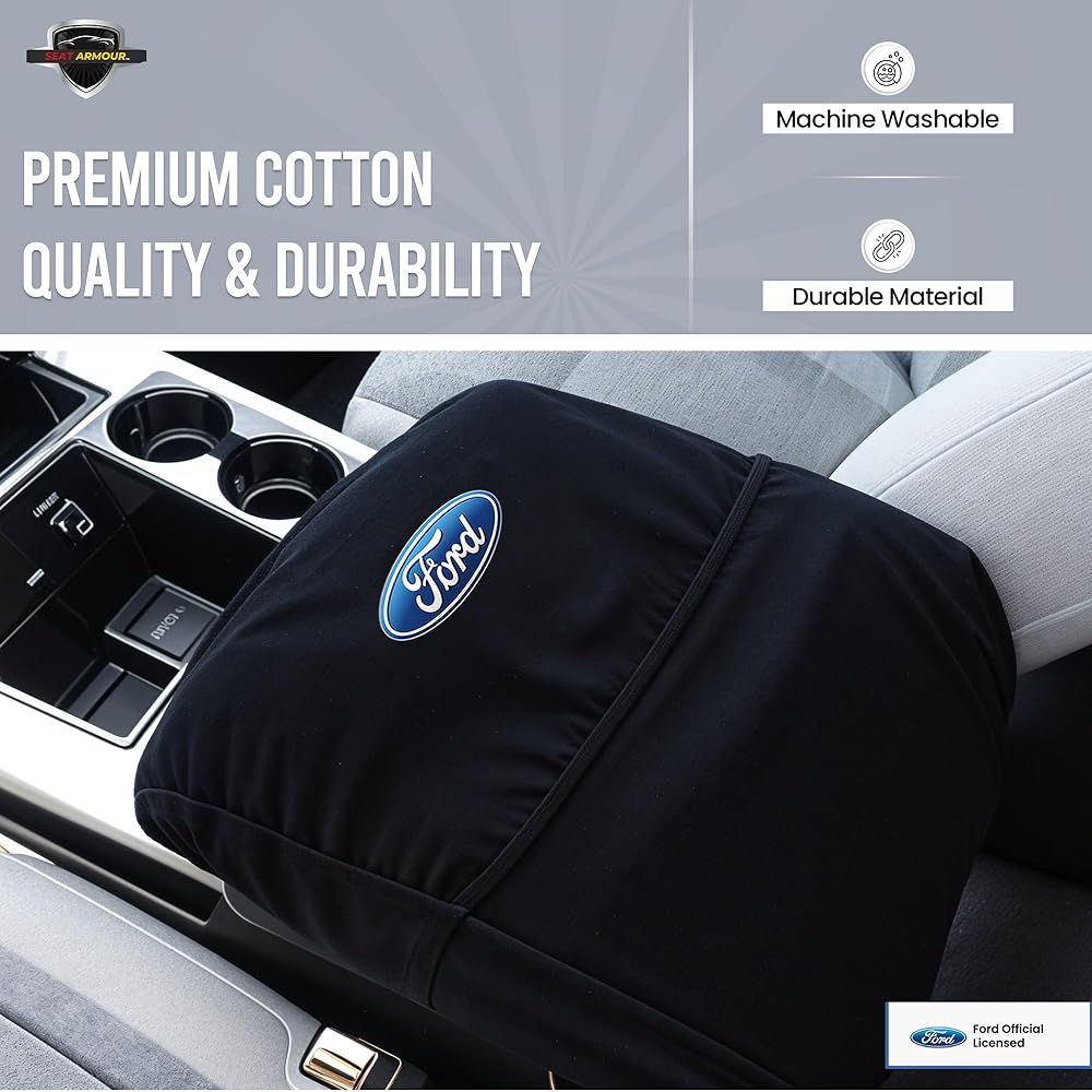 Seat Armour Center Console Cover for Ford F-150 (2004–2014) – Black, Custom Fit with Officially Licensed Embroidered Ford Logo – Soft, Durable & Machine Washable