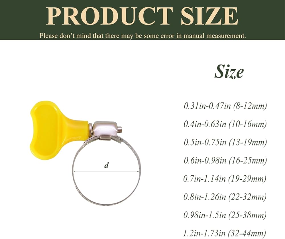 【 Adjustable Key Hose Clamps 】You will get 15Pcs 22-32mm. The minimum diameter of the key-type band hose clamp is 22 mm (7/8 inch) and the maximum diameter is 32 mm (5/4 inch).