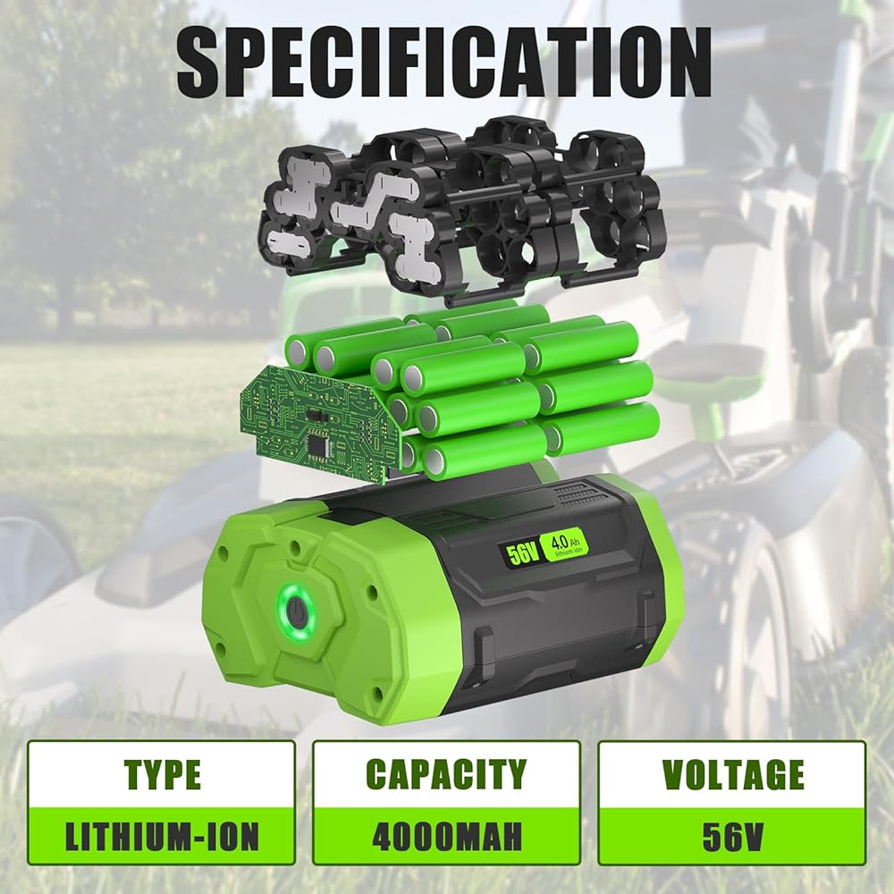 ✔【Battery Specifications】Type: Lithium-ion | Voltage: 56V | Capacity: 3500mAh | Watt: 196W | Pack: 1 Pack,Delivers up to 2X the run time than EGO 56V 2.5Ah battery.