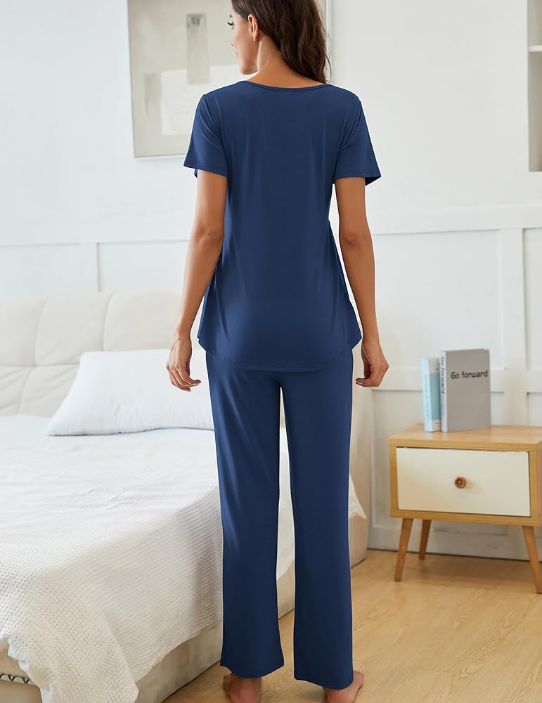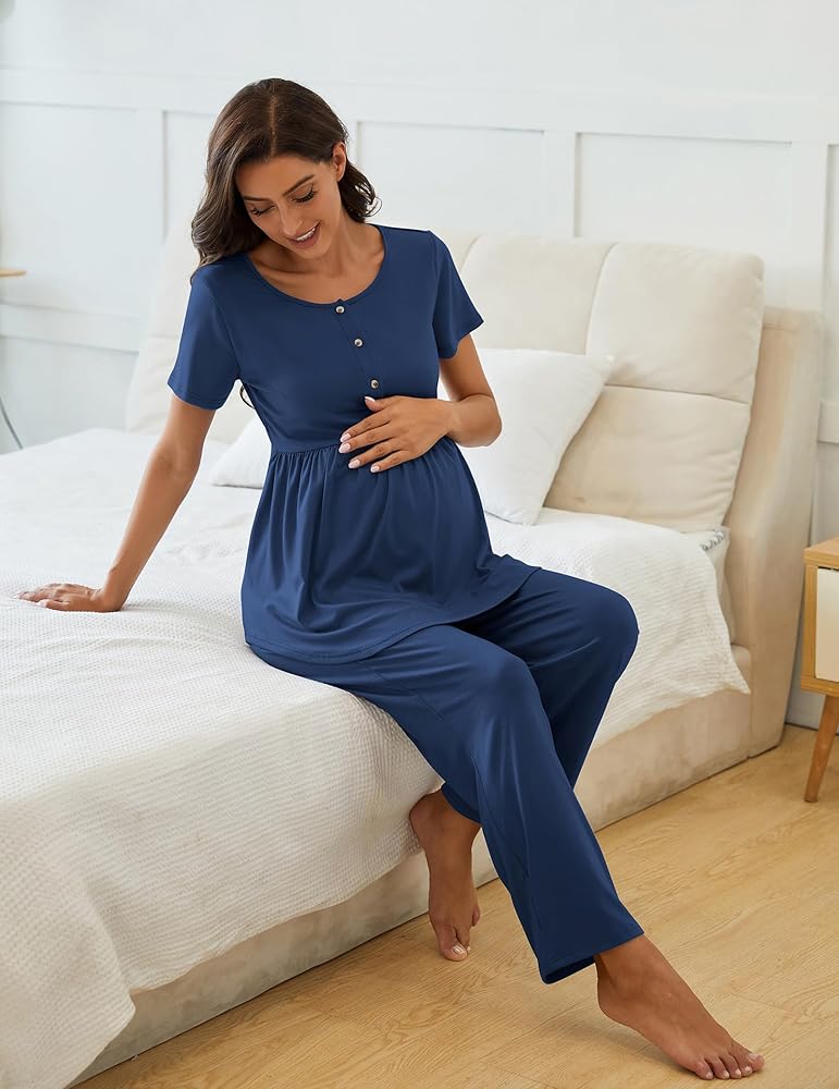 Nursing Top:Pajama top features button down which facilitates one handed breastfeeding and loose hem will not cause discomfort in belly.Crew-neck, short-sleeve maternity top is cool and soft.