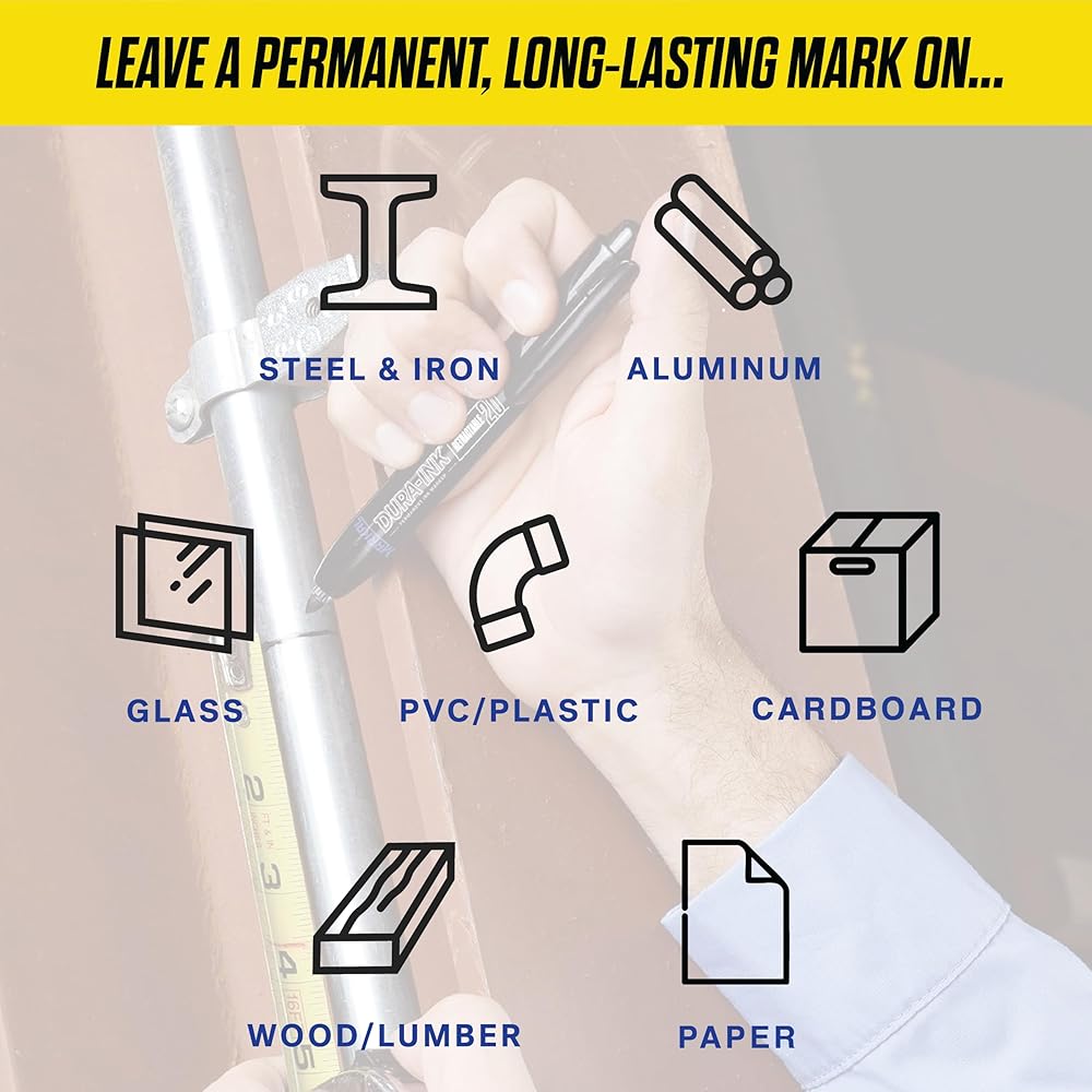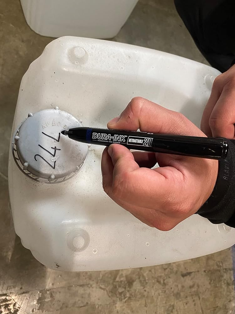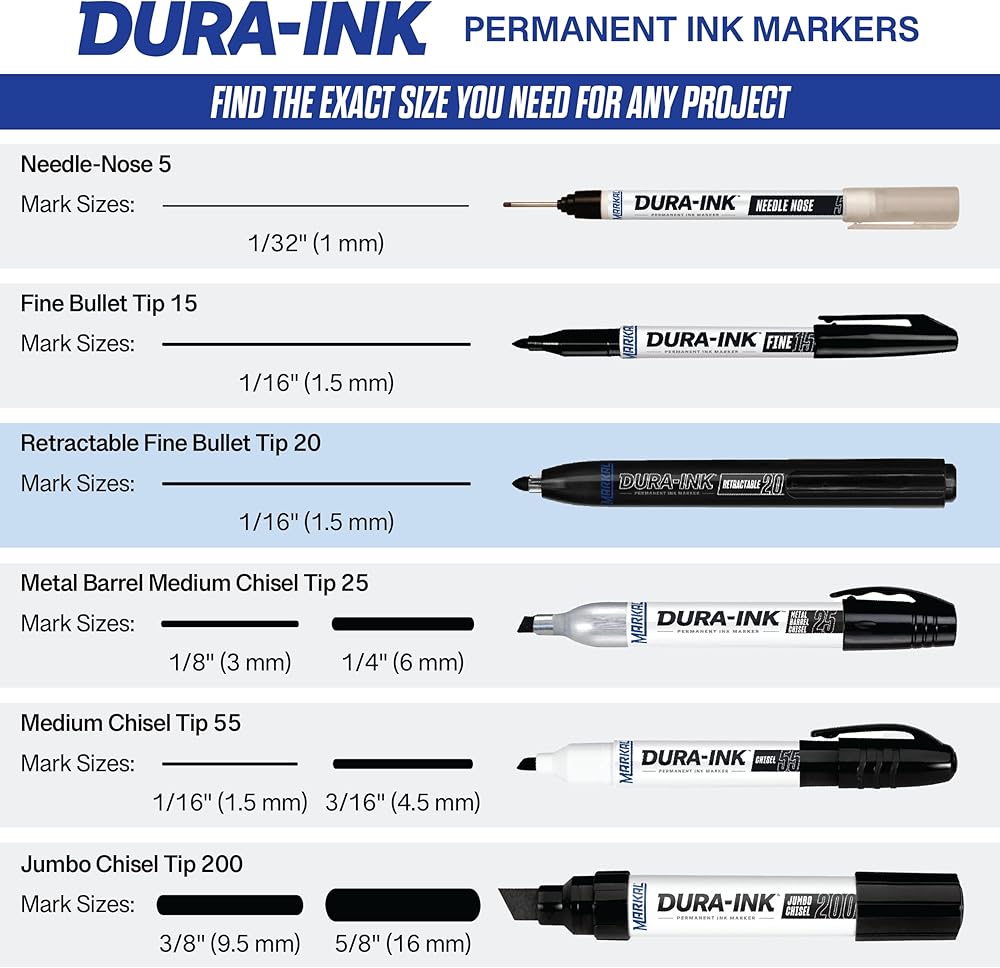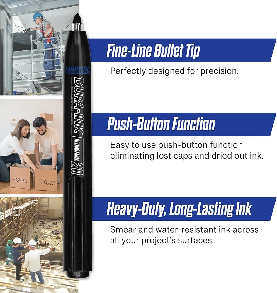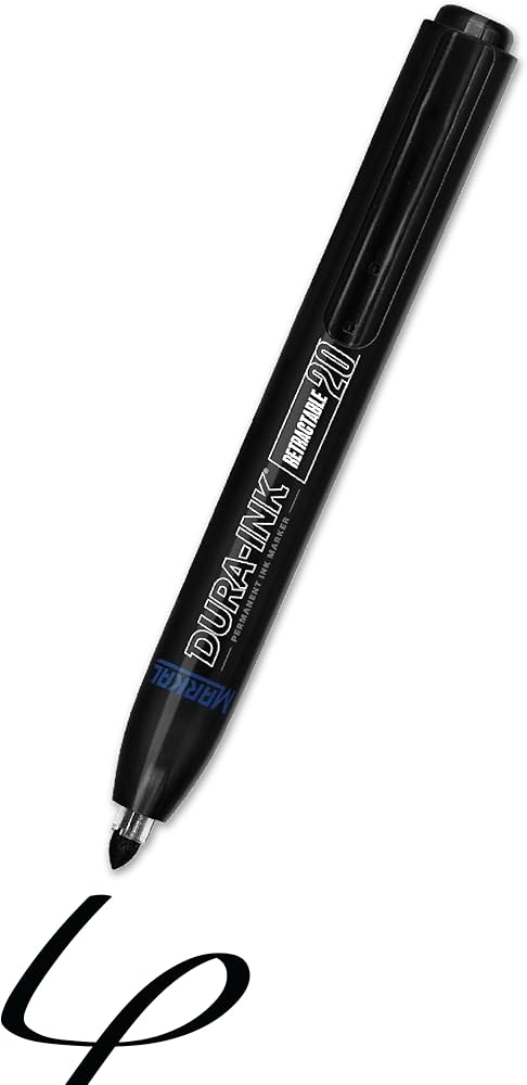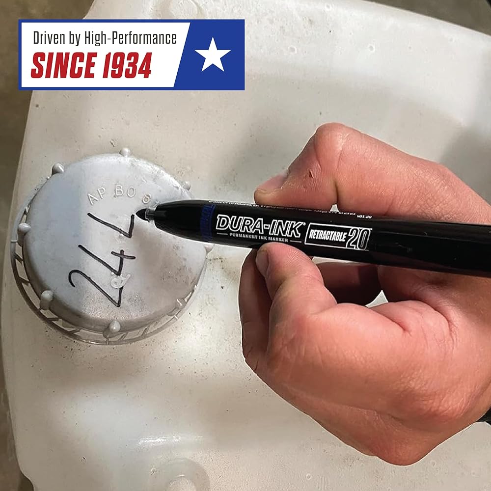The DURA-INK Retractable permanent ink marker uses a one-handed, push-button for easy opening and closing. The convenient capless feature makes it ideal for use in tight work spaces and eliminates mess or lost caps.