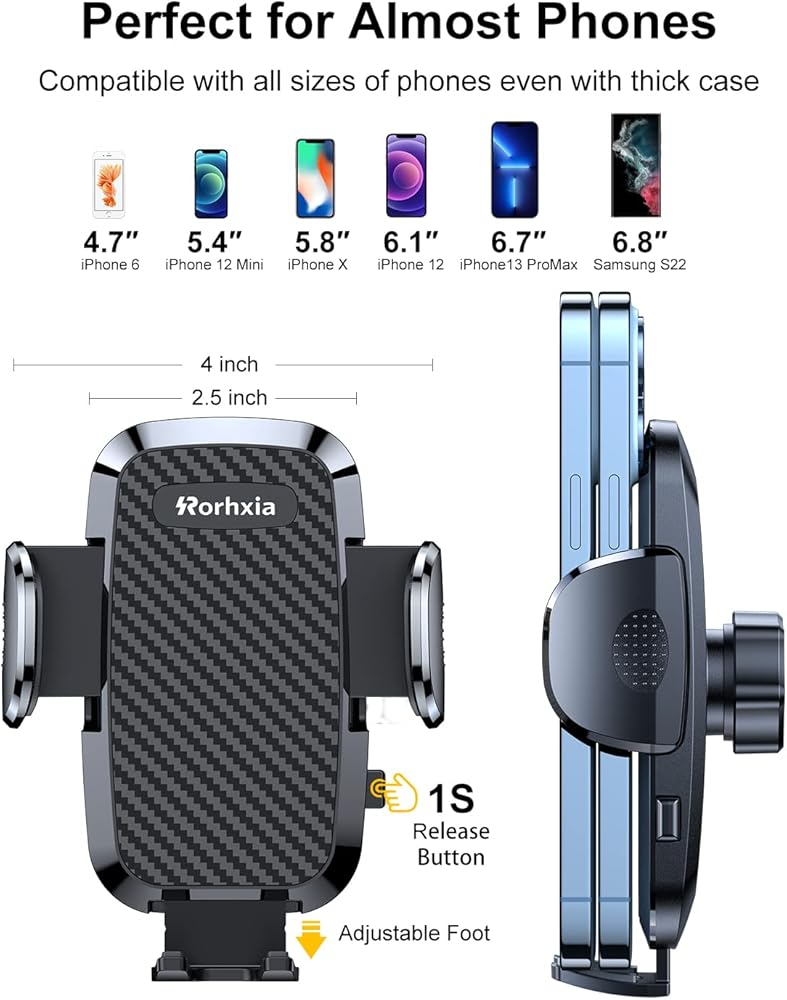 [Cool One-Button Release, Wide Compatibility]: Just a simple touch with one hand to release or lock your cell phone within seconds - Super easy to use while driving. Rorhxia mount with adjustable foot, thicker and wider clamp, making this car mount fit for all (4.0-7.0in) phones and case combinations, such iPhone Samsung Oneplus.