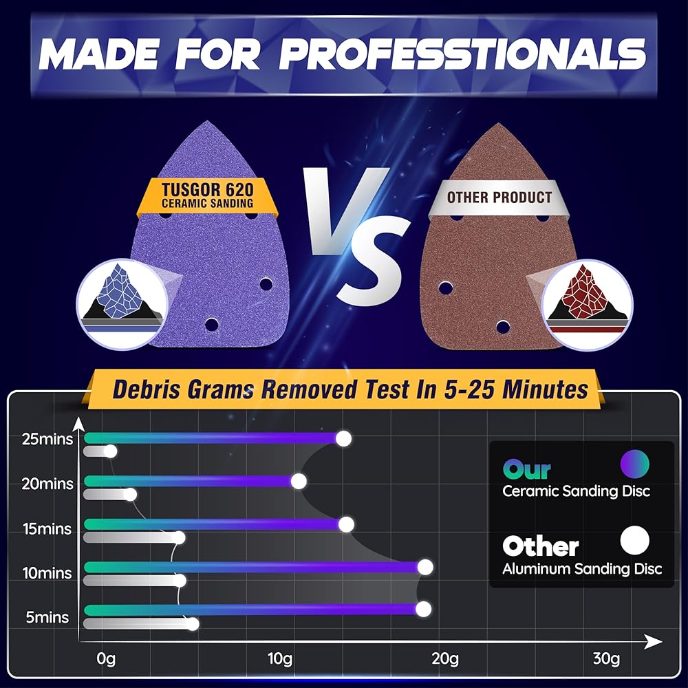 [Long-Lasting And Durable Performance]: After 25 minutes of continuous sanding, our product maintains an impressive 75% of its original sanding efficiency, significantly outperforming competitors whose efficiency drops to just 20%. This remarkable durability ensures consistent, high-quality results for longer, making it the superior choice for extensive projects.