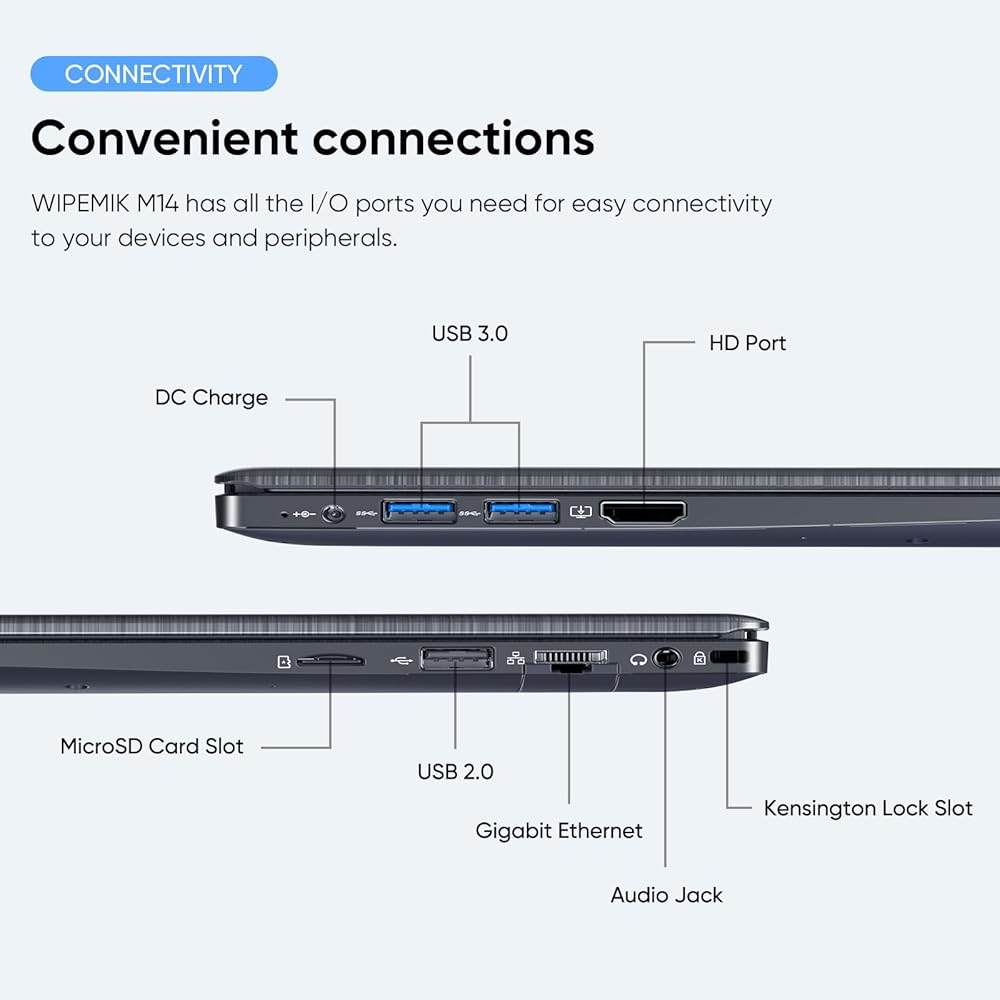 [ Ports + Connection ] - WIPEMIK M14 Laptops have 2 USB 3.0 ports, 1 USB 2.0, RJ45, HDMI port allows you to connect an external monitor for a larger screen, It also support 2.4G/5G dual-band Wi-Fi, It has all the I/O ports you need for easy connectivity