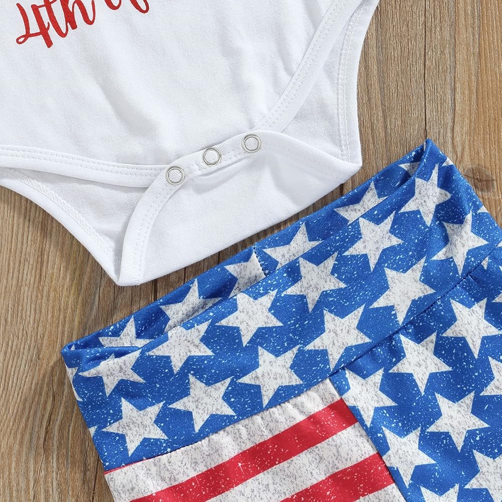 Design:Baby girl 4th of july outfit, usa letter printed, short sleeve romper top, snap closure for diaper change, matching American letter and flower print bell bottom leggings pants and headband, fourth of july baby girl outfit,baby girl Independence Day outfit,full of Independence Day atmosphere,Super cute baby girl bell bottom outfit, makes your baby girl more adorable and pretty