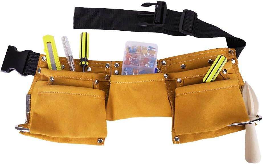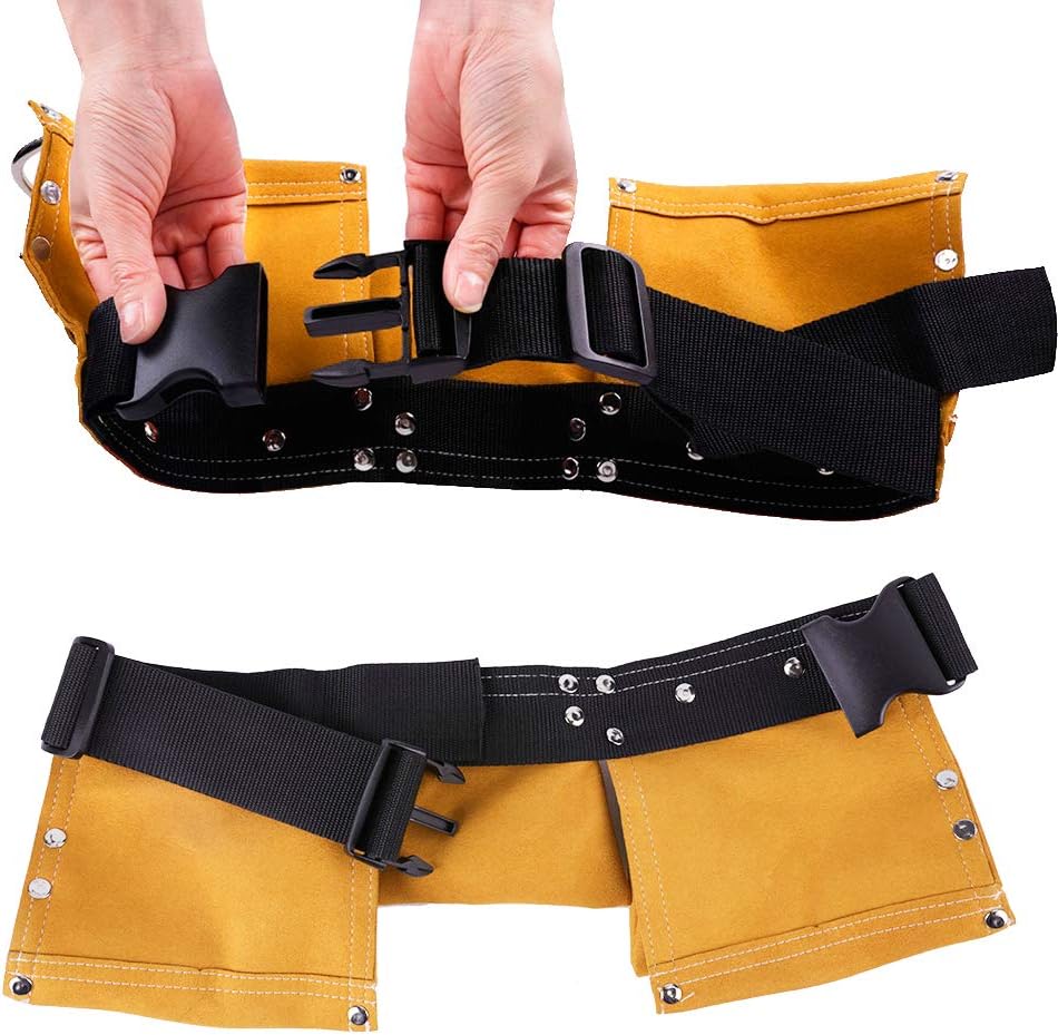 Construction: 1 Tape Measure Pocket, 4 larger pockets for tools (such as pliers, screwdrivers, sockets, and wrenches), 2 steel hammer rings.