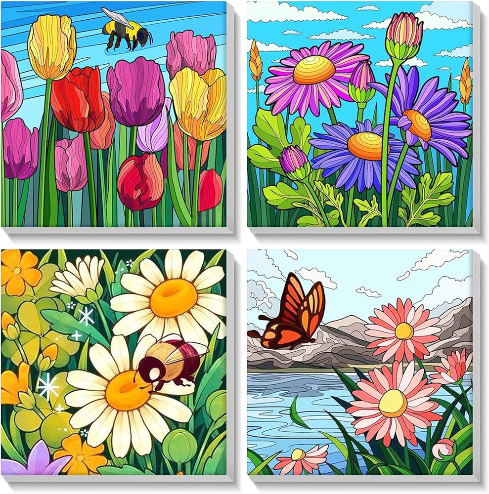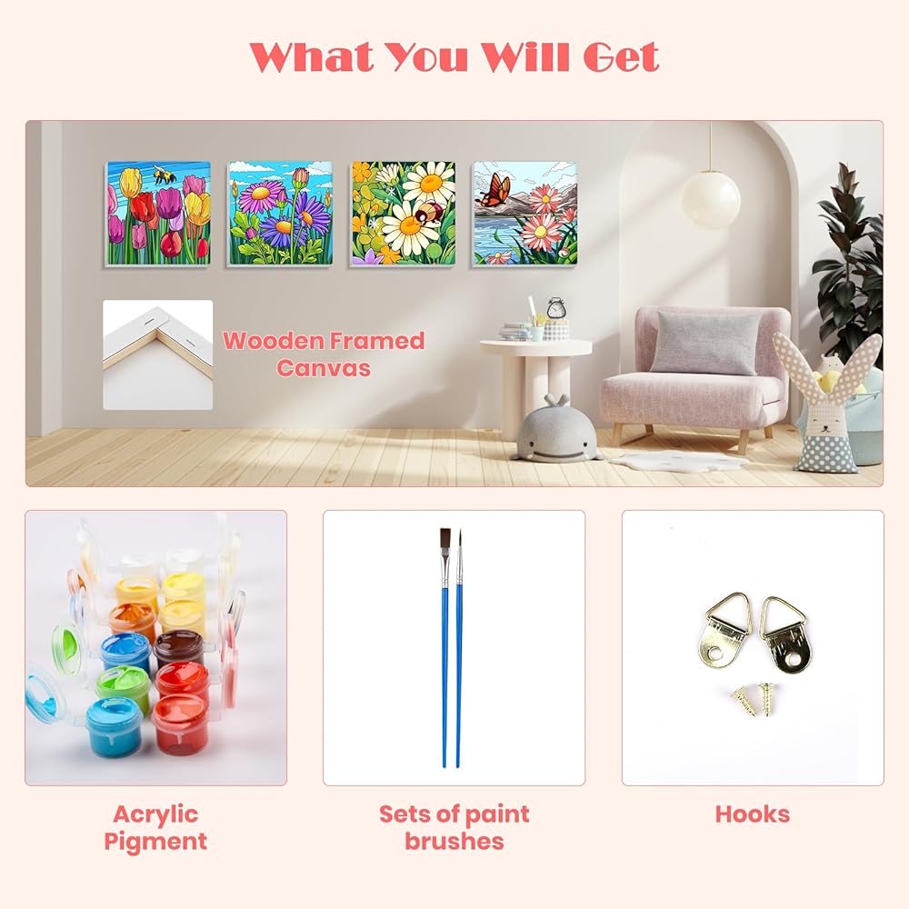 【What You Get】Kids paint by number comes with everything you need. 4 digital painting kits including pre-printed textured art canvas (unframed), 12 high-quality paintbrushes.