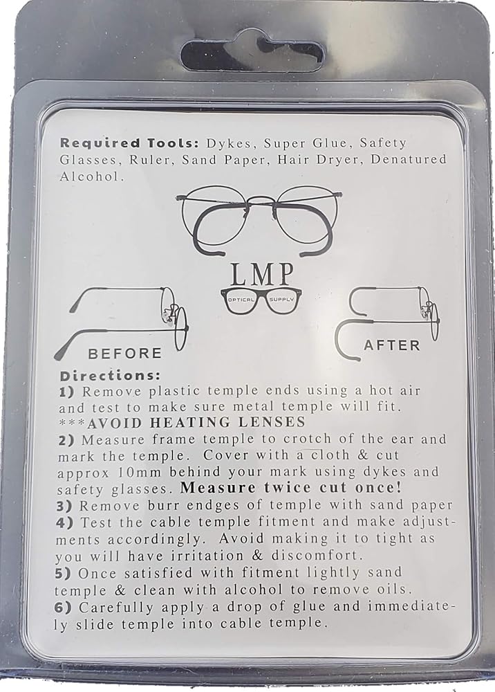 LMP Optical Cable Temple Retrofit Kit Includes Glue Fine Sandpaper & instructions Universal Fits Most Metal frames 1.3mm THE KIT: This kit comes in our retail packaging that features a full description of tools and instructions at converting your glasses into a pair of cable temple glasses. Depending on the pack size you select you get a premium pair of ultra-soft cable temples, Bonding glue and sandpaper to remove burr's after cutting.