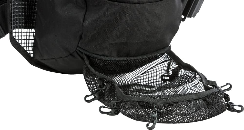 Chest Harness system with Velcro elastic bands for flexibility Stowable outer mesh carry-all flap Front pocket for smaller accessories