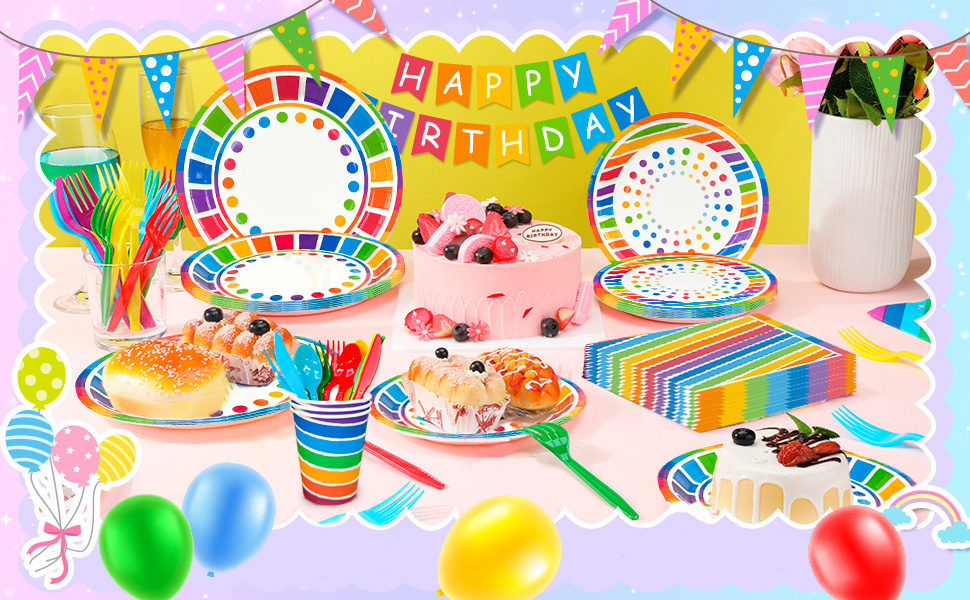 😃Perfect Rainbow Party Supplies Set😃 Our rainbow themed birthday party decorations supplies set includes 1 rainbow birthday party table cloth, 1 rainbow happy birthday banner, 12 rainbow birthday balloons, 20 rainbow party cups, 20 7'' rainbow party plates, 20 9'' rainbow birthday party plates etc rainbow birthday decoration supplies.