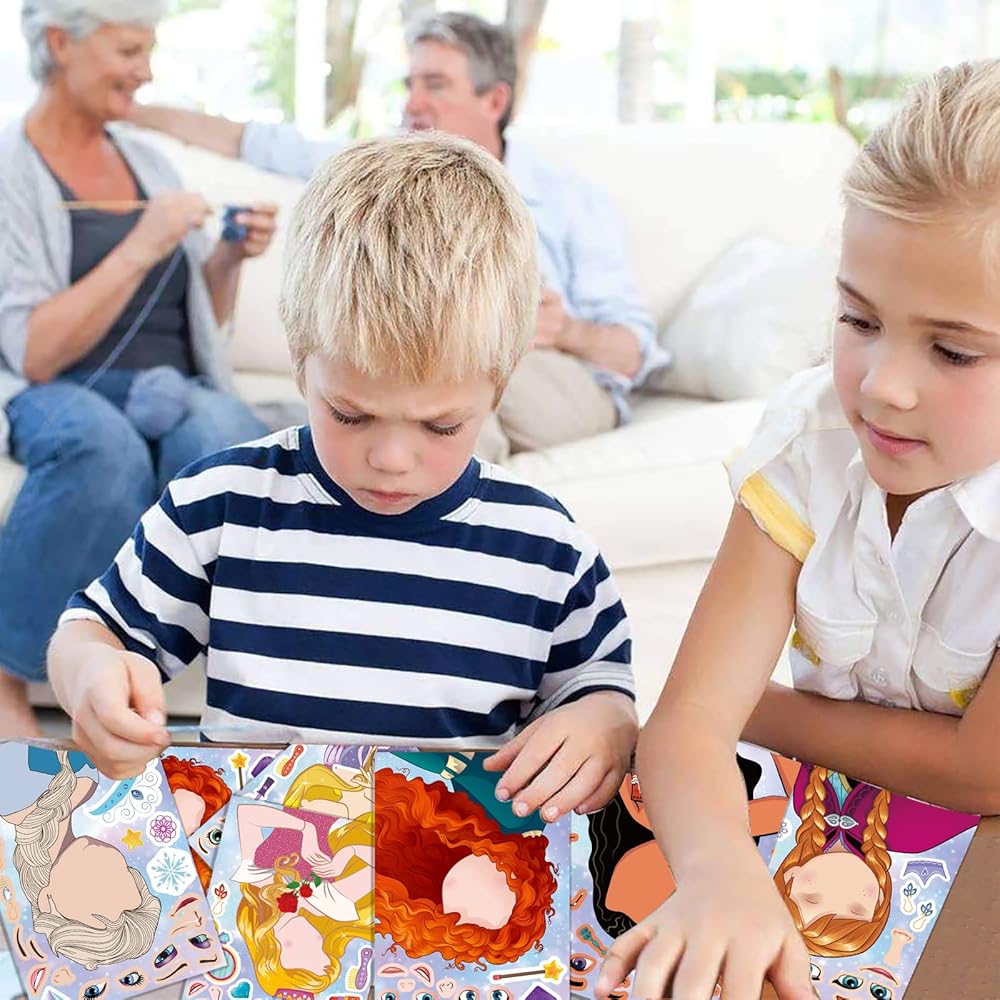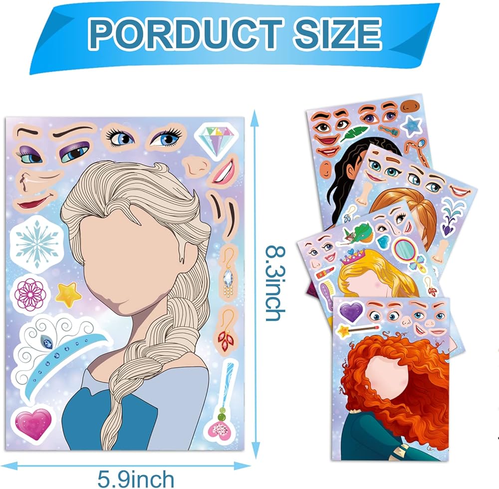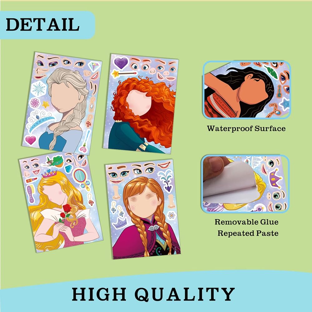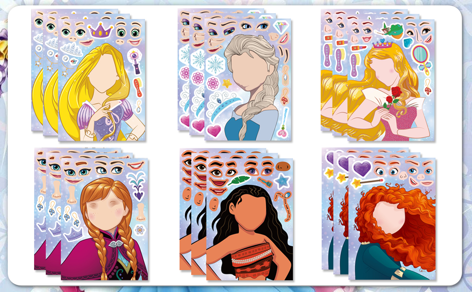 Value pack of princess stickers:Traditional stickers is thin and once the stickers are stuck, they can't be torn down. children have only one chance to create. Our stickers are different.it cover the surface with protective film and lubrication coating, small stickers will never be ripped and there is no problem for repeated pasting.There is no need to worry about putting the little stickers in the wrong place on the face.