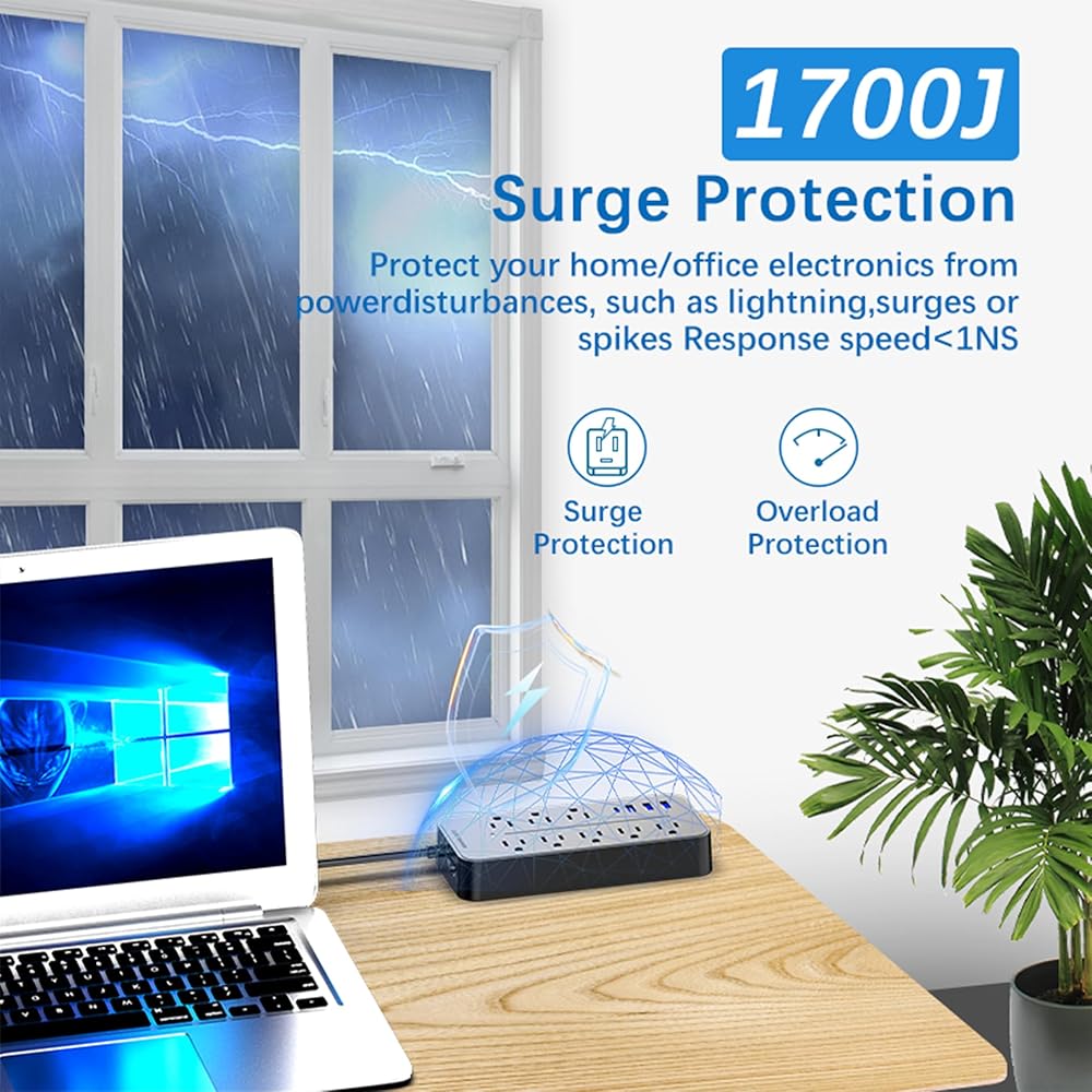 High-Grade Surge Protector 1700 Joules: Experience the peace of mind that comes with using our high-grade surge protector power strip. It safeguards your electronics against voltage fluctuations, surges, and spikes, making it the perfect power solution for home and office use.