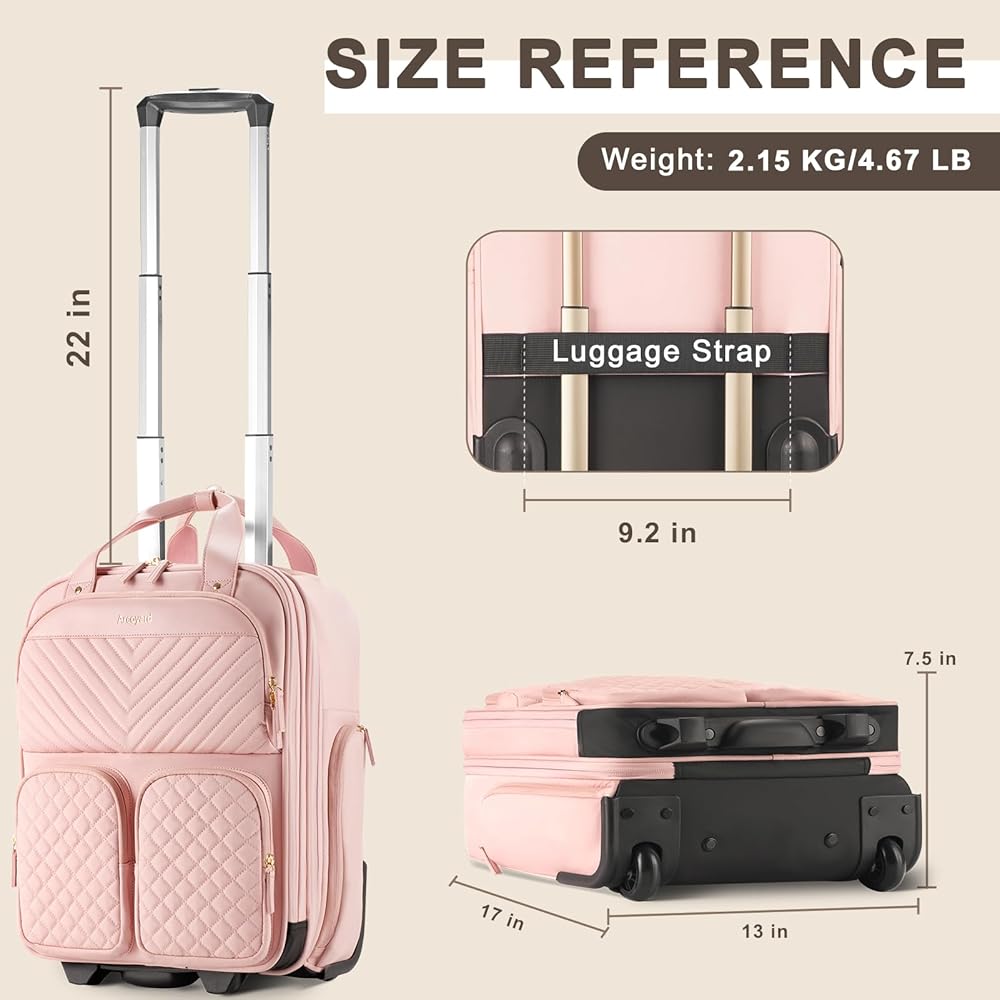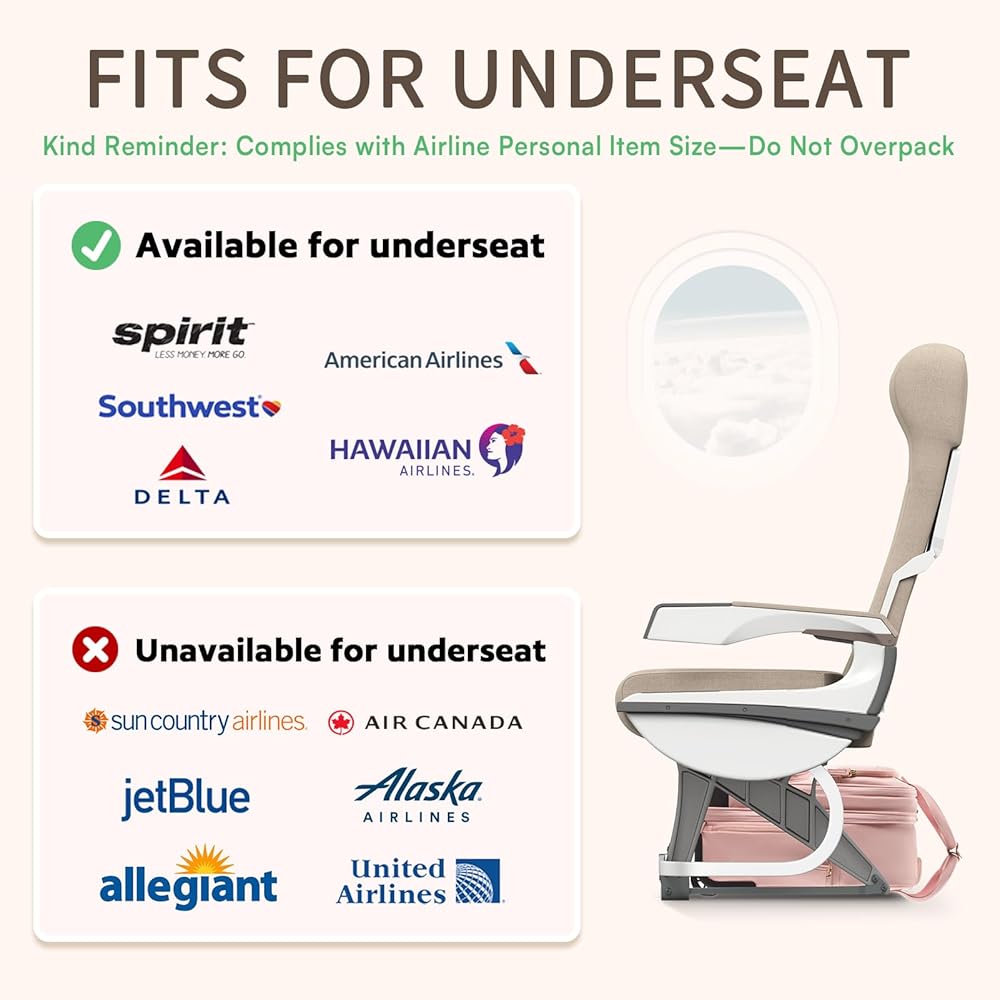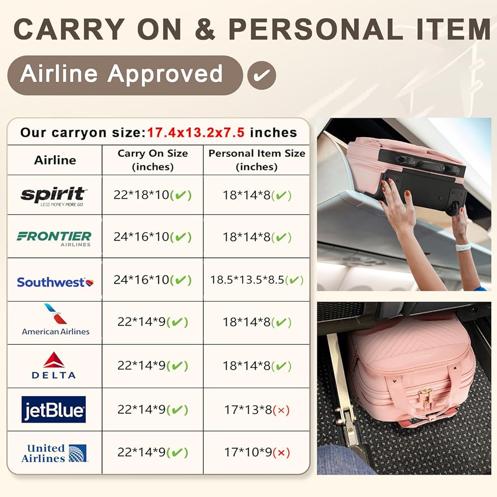 【Airline Approved】Carry on luggage with wheels measures 17.4" H x 13.2" L x 7.5" W (including the height of the wheels), meeting approved airline carry on luggage dimensions. It easily fits into overhead bin and under the seat. This underseat carry on luggage with wheels complies with major airlines' published carry-on luggage and personal item size requirements, including Delta Airline, Southwest Airline, Spirit Airline and Frontier Airline ect.
