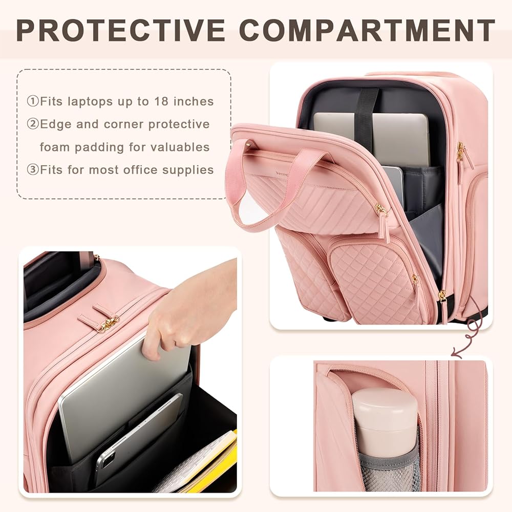 【Multifunctional Compartments】The main compartment provides ample space for all your travel essentials and clothing. It also includes a waterproof pocket to protect your toiletries from leaks and spills. Additionally, there's a foam-padded compartment that can safeguard two laptops up to 18 inches in size simultaneously. Three front zippered pockets offer convenient access to frequently used items, keeping everything organized and easily reachable.