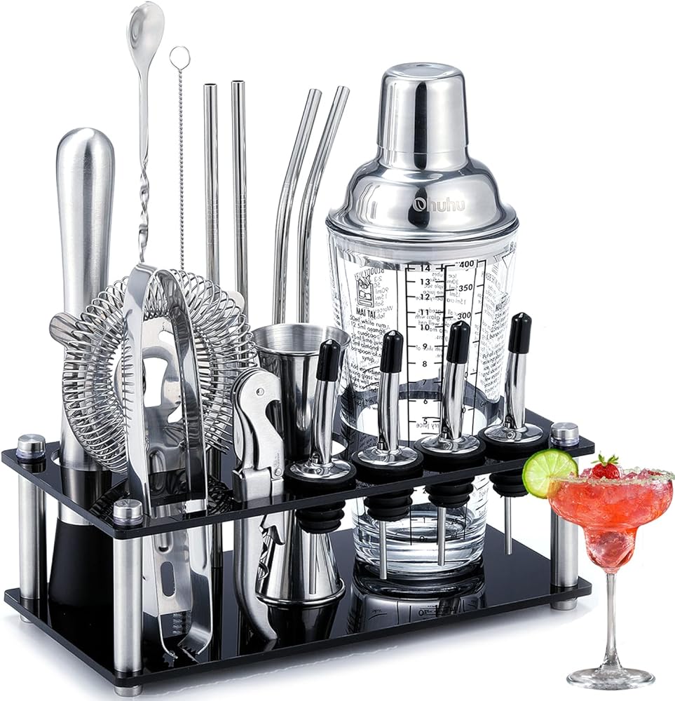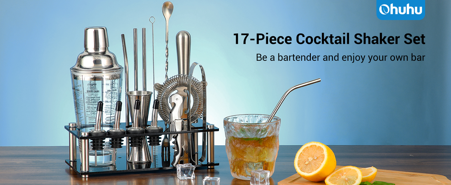 Cocktail Shaker Set Ohuhu 17-Piece Bartender Kit Bar Tool Set with Acrylic Stand Premium Soda-Lime Glass Drink Shaker with All Bar Accessories for Beginners Home Bar Parties