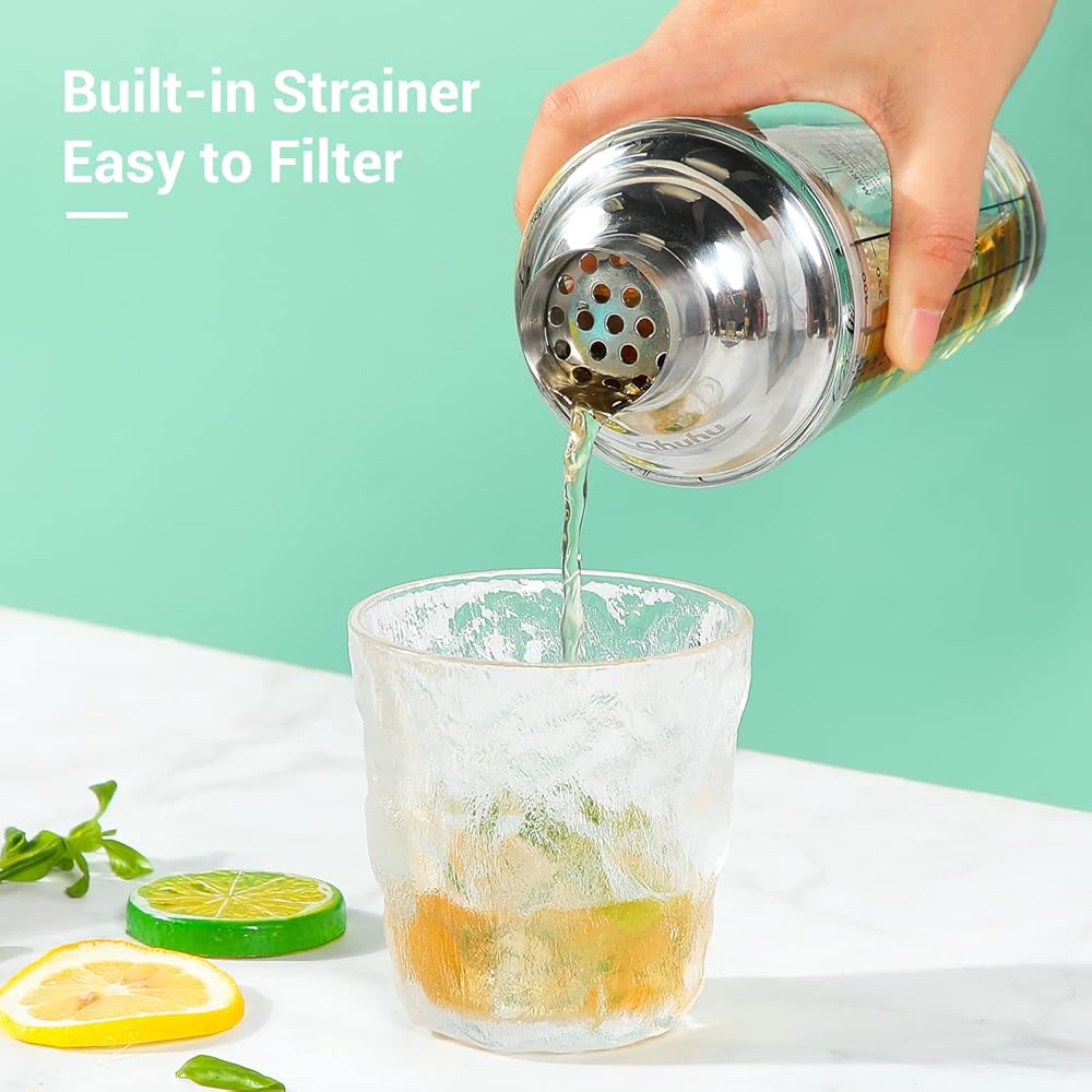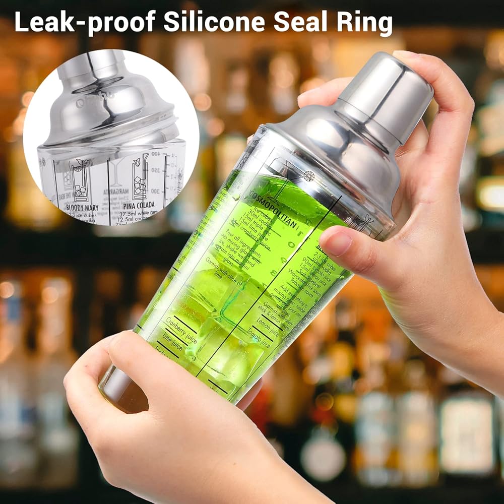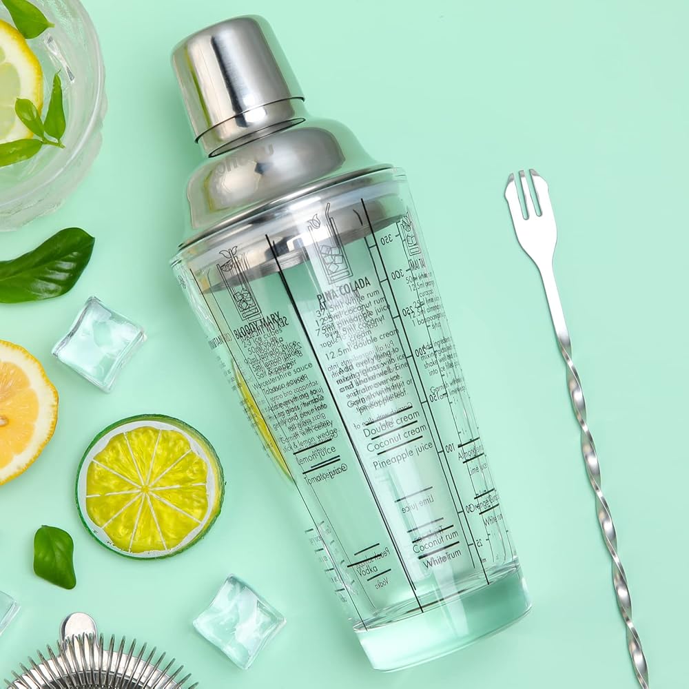 Unique Shaker Design: Built from food-grade, soda-lime glass, you've never seen a more sturdy, durable and beautiful crystal drink shaker. Thanks to the helpful millimeter markings and informative drink recipes, it's easy to make the delicious cocktails you've always wanted to.