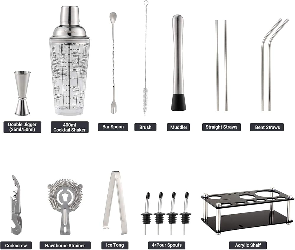 Deluxe 17-Piece Shaker Set: Wow my friends, impress your dates and be the masterful bartender you've always wanted to be! Each bartender kit includes 1 400ml Cocktail Shaker, 1 Muddler, 1 Ice Tong, 1 Corkscrew, 1 Double Jigger (25ml/50ml), 1 Hawthorne Strainer, 1 Bar Spoon, 2 Straight Straws, 2 Bent Straws, 1 Cleaning Brush, 1 Acrylic Stand, and 4 Pour Spouts.