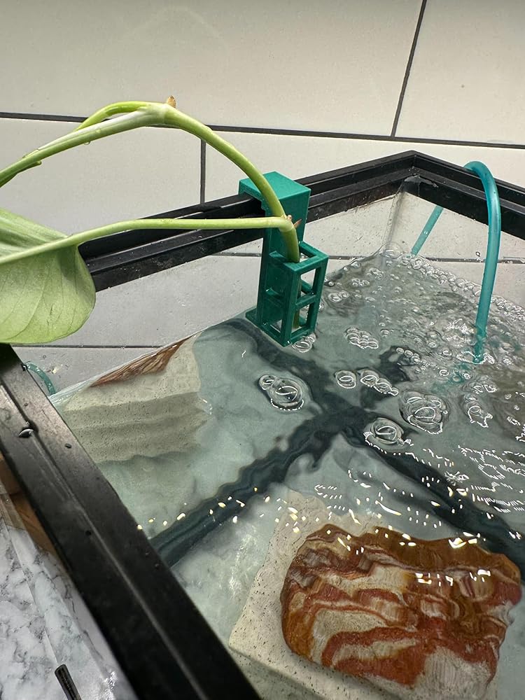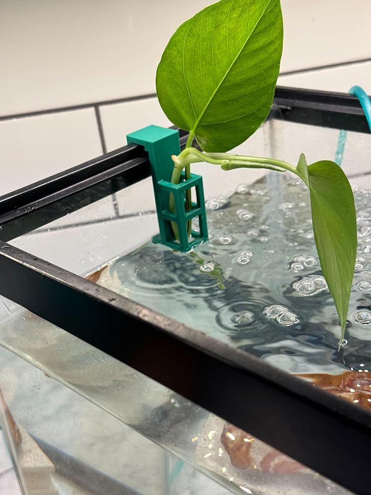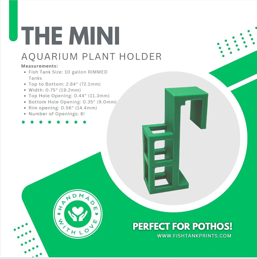 This Aquarium Plant Holder is 3D Printed using aquarium-safe PLA Filament. This super simple design is such a helpful little thing, simply put your stemmed plant clipping into one of the openings, slide it over the rim of your aquarium, and make sure the roots are touching the water and that's it! Whether you're using Pothos, Philodendrons, Swiss Cheese plants, Bacopa, or any other aquarium-safe thin-stemmed plant, your fish will be super happy with the results. Your plants will help in the removal of dangerous nitrates that occur naturally in your aquarium from your fish's waste.Measurements:★Fish Tank Size Accommodation: 10-gallon RIMMED Tanks★Top to Bottom: 2.84" (72.1mm) Width: 0.75" (19.2mm)★Top Hole Opening: 0.44" (11.3mm)★Bottom Hole Opening: 0.35" (9.0mm)★Rim opening: 0.56" (14.4mm)★Number of Openings where your roots and stems will be able to go through for ease: 8!