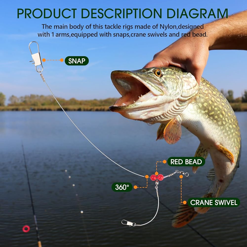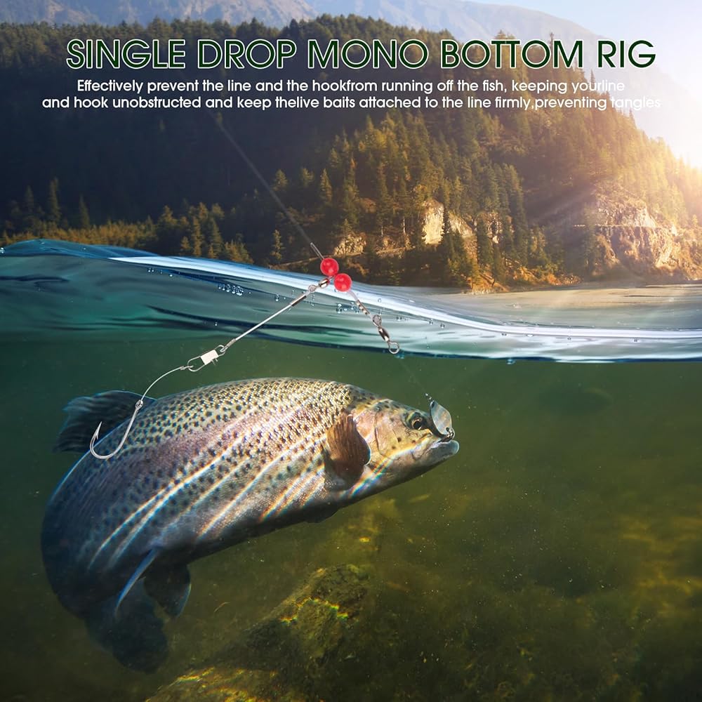 High-Speed Swivel Snaps with Fishing Beads to Prevent Line Tangles: Our fishing Single Drop MONOFILAMENT rig is made from top-quality mono filament, ensuring it's tough and reliable. This material is super strong and resistant to wear and tear, so it can handle whatever fishing challenge comes its way. And with the addition of high-speed swivel snaps and fishing beads, it puts an end to those annoying line tangles, letting you focus on reeling in the big ones without any hassle.