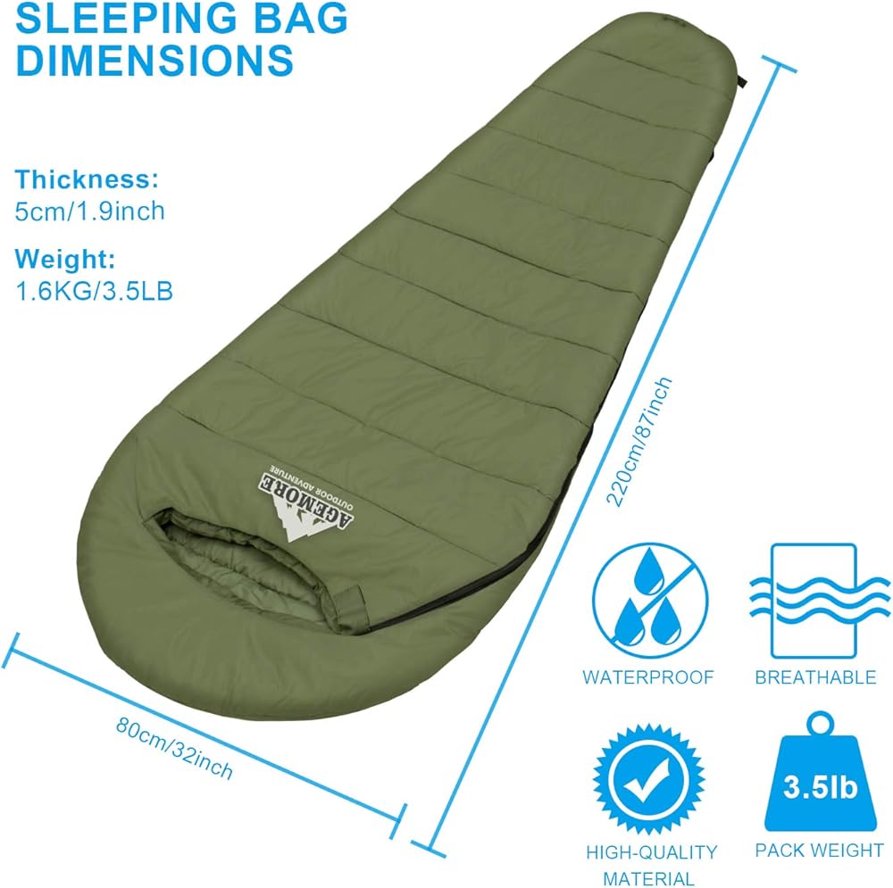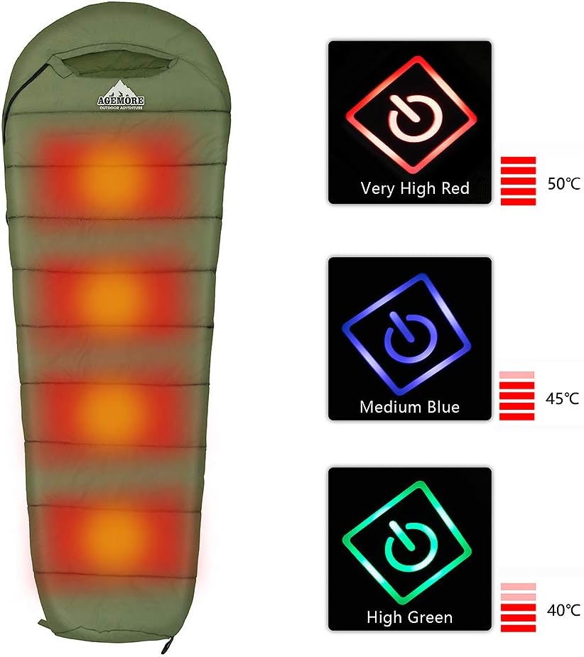 Perfect for Camping: AGEMORE heated mummy sleeping bag is designed for both warm and cold weather outdoor activities, expecially for camping, backpacking, hiking or traveling. Perfect fit for truck, ten or camper van.