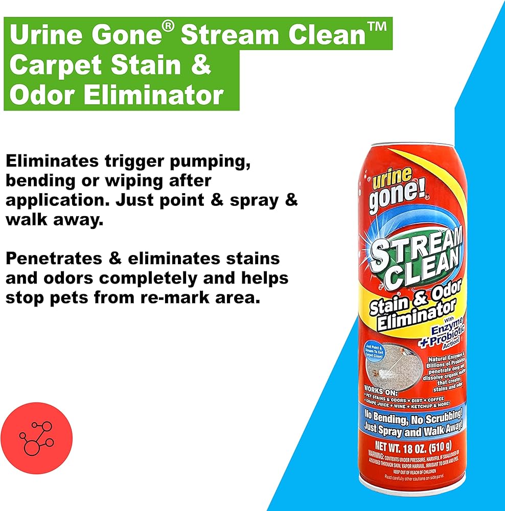 Urine Gone Stream Clean, Heavy Duty Carpet Stain & Odor Eliminator Deep Cleans with Fast Acting Natural Enzymes + Probiotics Eliminating Stains and Odor Permanently, No Scrubbing, 18 oz. (1pack)
