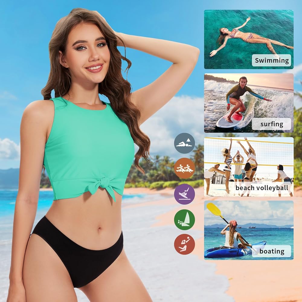 SUN PROTECTION BIKINI CROP TOP: Sleeve rash guard tank tops made with UPF 50+ protective fabric to provide essential body coverage and shield you from rashes, scrapes, and harmful UV rays.