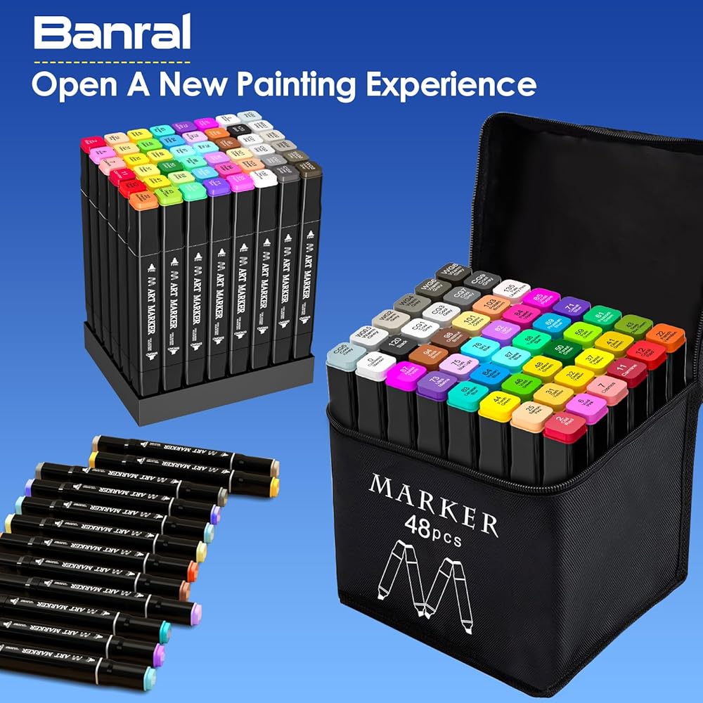 Banral 48 Colors Alcohol Markers Set, Dual Tip Alcohol Based Art Marker for Artists Adult Coloring, Permanent Illustration Sketch Pens for Drawing with Case and Holders