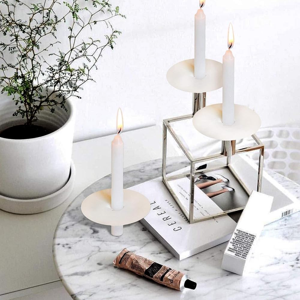 HIGH QUALITY smooth great-looking white unscented 5 inch slim stick candles; Drip protectors are made of heavy duty paper that prevents bending and spillage and have a shiny white finish on both sides and are 3 inches in diameter