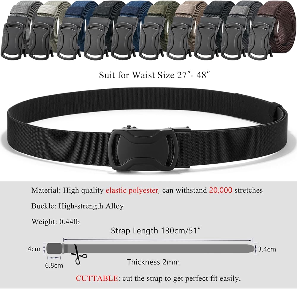 Fully Adjustable for Your Size: You can precisely adjust your belt to the perfect fit. Automatic Buckle,no holes in belt. ◆If the Strap is too long for you, you can trim the strap length to fit your own size. ◆This Nylon Belt Is Suitable for Pant Size Below 46inches Such as 32- 46in.