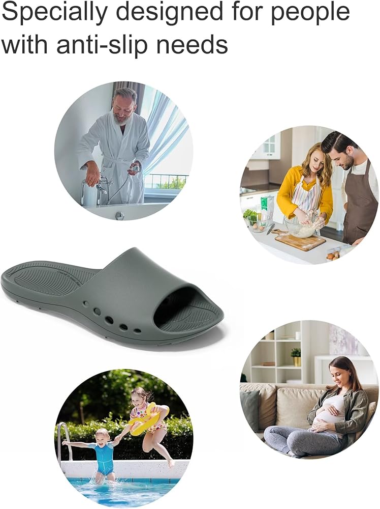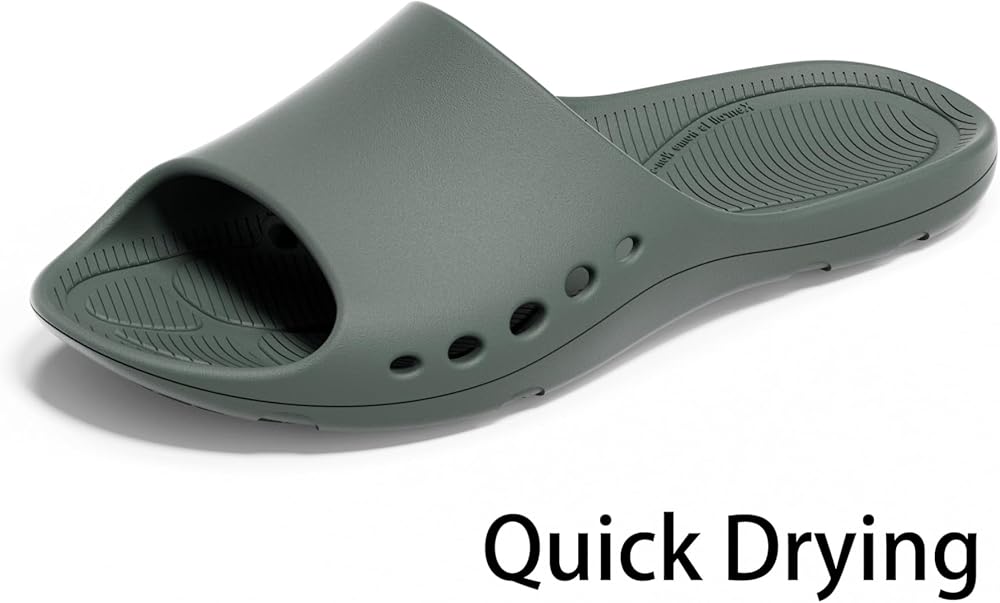Shower Slides with Holes - There are two hidden air holes at the bottom of the slippers and five air holes on the sides, which can speed up air circulation and prevent your feet from retaining water
