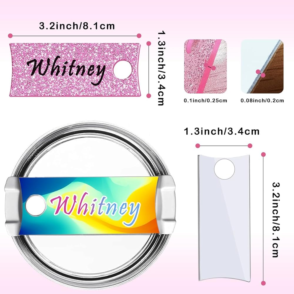 Easy to DIY: For the aluminum Stanely name tag, you can use a heat press machine for heat transfer printing on both sides, no need for mirrored printing, The name plate toppers streamline the process; For the acrylic Stanely name tag, you can use a brush or marker to write/draw any marks on both sides, and it can be wiped and rewritten/repainted