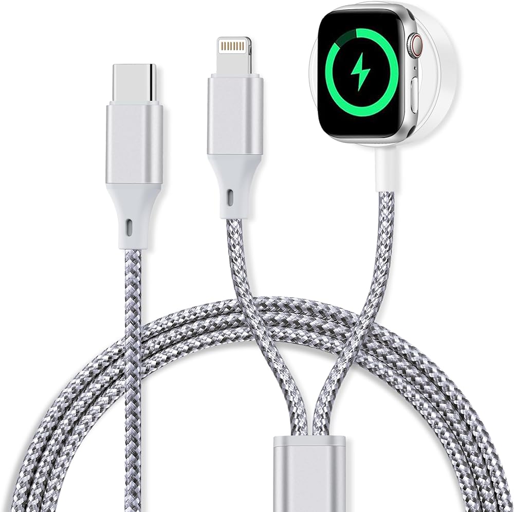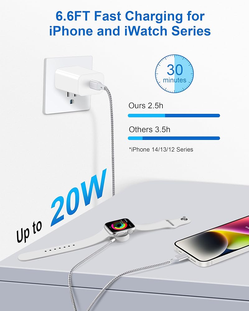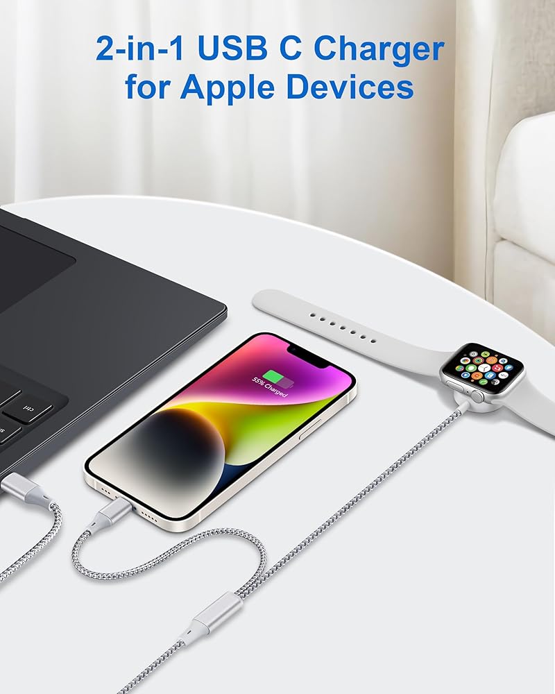 【2 in 1 Fast Charging Design】: 2 in 1 upgraded for apple watch charger usb c cable 6.6FT/2M can simultaneously charge which iPhones and Watches, AirPods, iPad. It can fast fully charge your phone or watch within 2.5 hours.