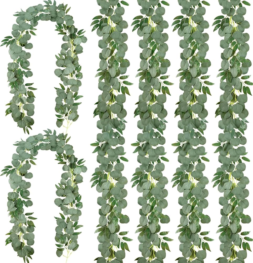 Package includes 6 packs of artificial eucalyptus leaves garland with willow leaves in gray-green.