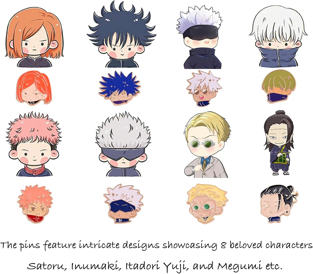 التصميم: مستوحاة من عالم جوجوتسو كايسن، تتميز الدبابيس بتصميمات معقدة تعرض 8 شخصيات محبوبة، بما في ذلك ساتورو وإينوماكي وإيتادوري يوجي وميجومي.