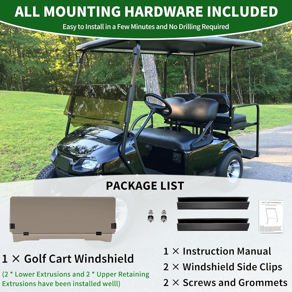 ALL HARDWARE IS INCLUDED: Easy and quick to assemble in 5 mins with step-by-step instruction manual which doesn't need any tools and no drilling or modification is required. The windshield for ezgo golf cart comes with protective film on all sides of the windshield.