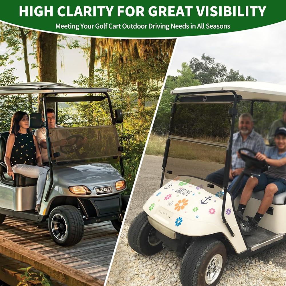 GREAT VISIBILITY IN ALL SEASONS: The ezgo windshield for golf cart is sophisticated made, features reduce glare and UV protection. It's good for protecting passenger against windstorms, dust, twigs, ensure more driving outdoors safety when under changing weather.