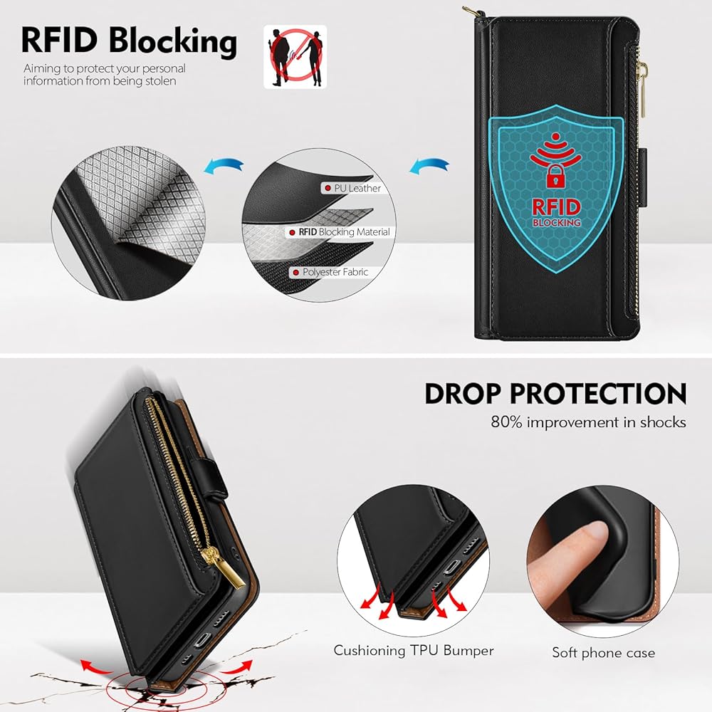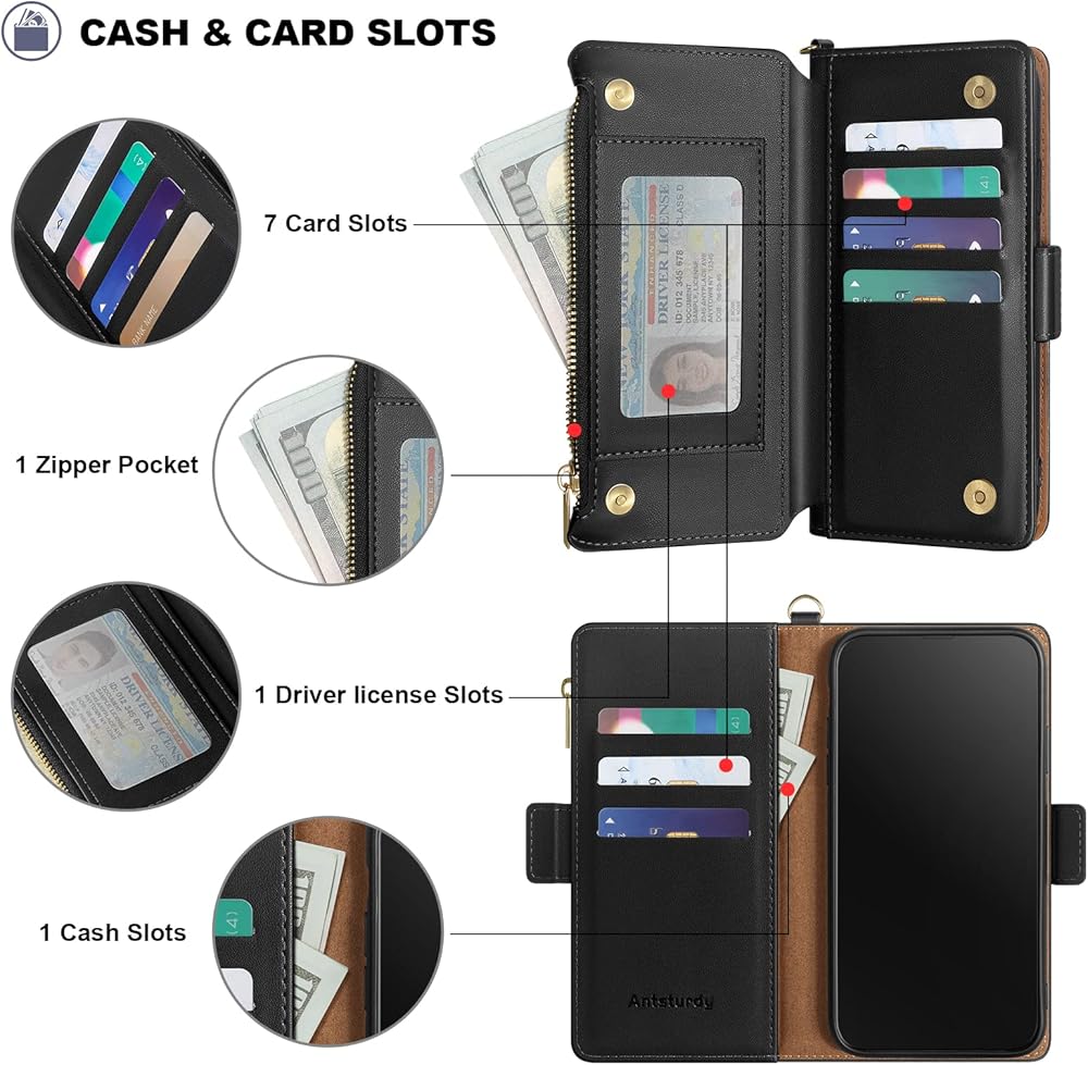 Antsturdy Compatible with Samsung Galaxy A71 5G Case Wallet with Card Holder Women Men,PU Leather Phone Case RFID Blocking Flip Folio Protective Cover Wrist Strap Zipper Credit Card Slots,Black