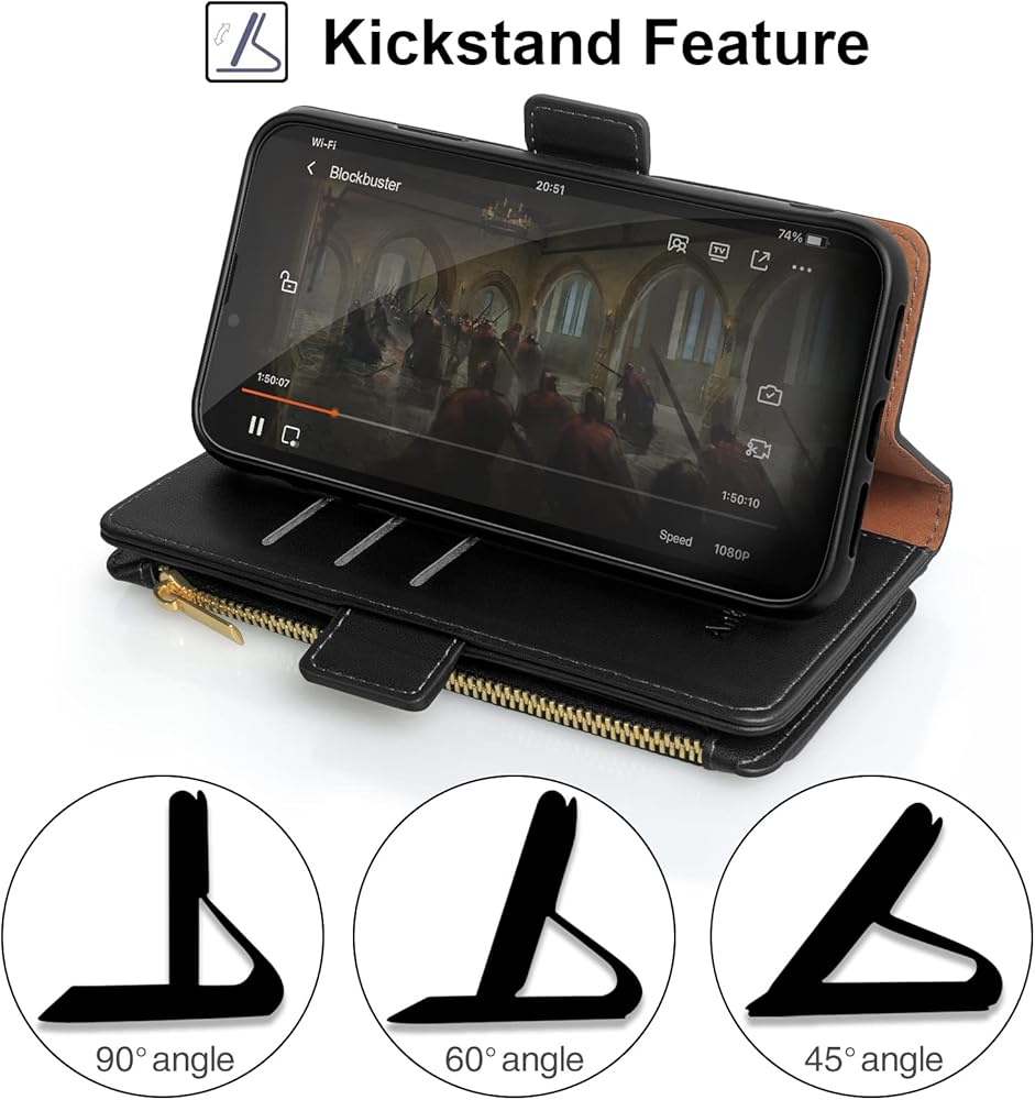 <b>[ With portable wristband and Kickstand Function ]</b>:<br>Deliver a PU leather portable wristband connected to the wallet protective case. Kickstand Function is convenient to watch movies or video chat. The strong magnetic button keeps the leather case closed all the time and protects your phone more effectively. The internal TPU case has precise cut-out buttons for easy touch and quick response. The soft TPU inner shell protects the phone from shock-absorbing and shock-proof edges. <br>
