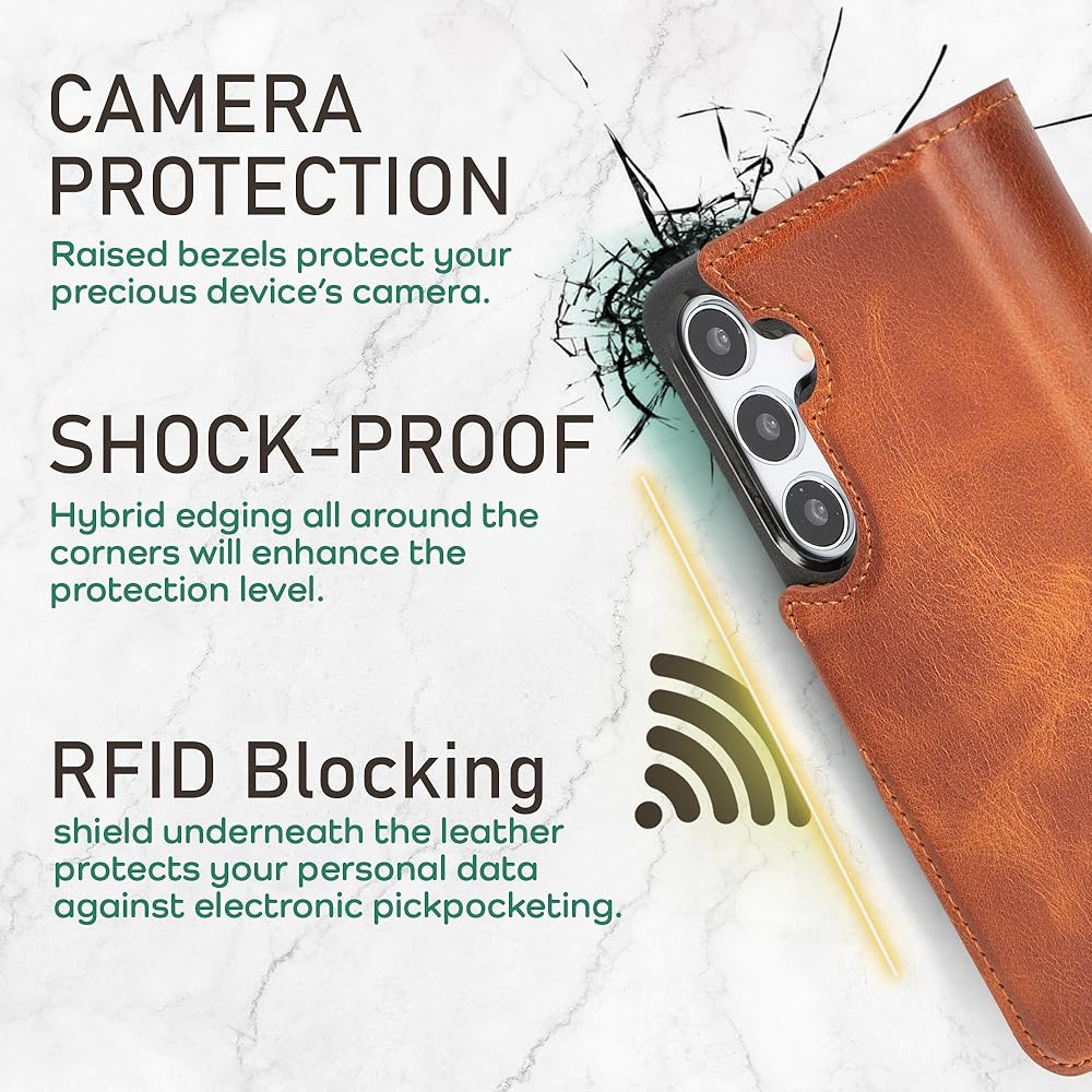 🌟Overall Features: Wireless Charging compatibility, Magnetic phone wallet with secure snap-on case, Strong magnets, Luxe suede interior lining, Raised bezels for camera/screen protection. European craftsmanship with authentic cowhide leather. 8 card slots, including ID/driver's license slot. Elevate your S24 Ultra accessories with our Samsung Galaxy S24 Ultra leather wallet case, seamlessly blending style and function for a S24 ultra case magnetic.📱💼🌍