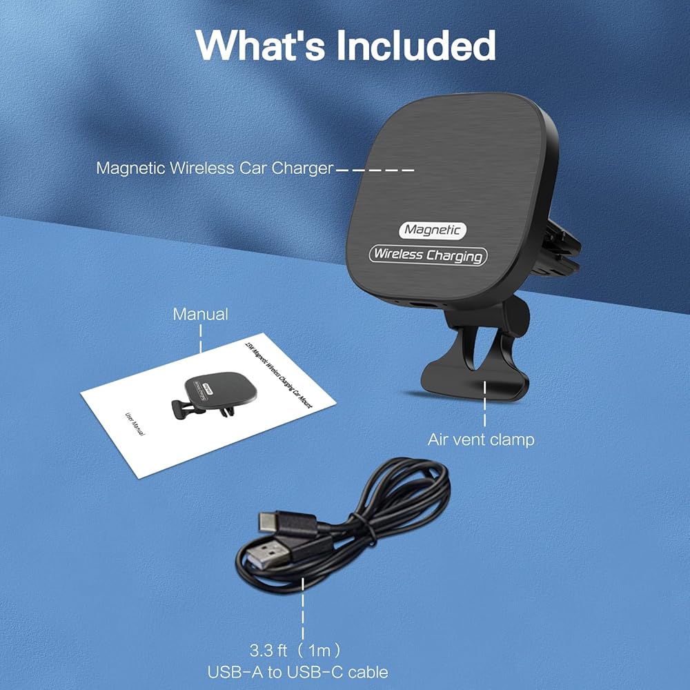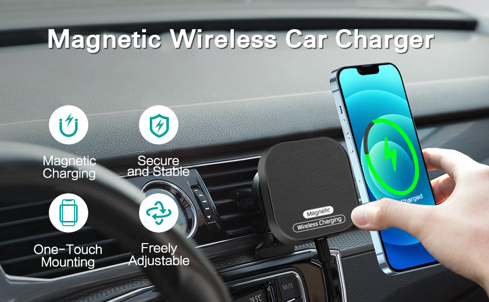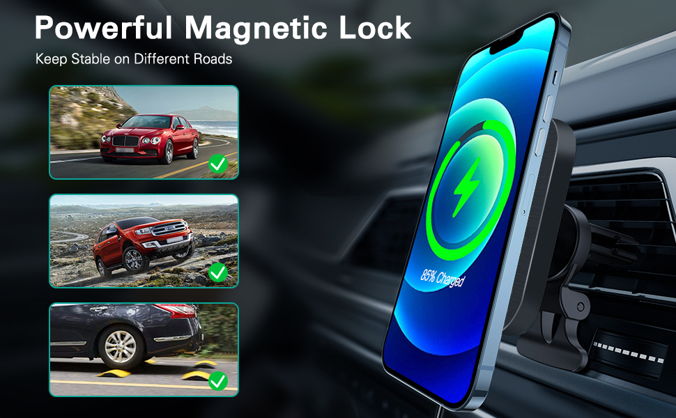 【Auto-Lock Magnetic Charging】The car charger mount combines wireless charging technology with a powerful magnet, the built-in magnetic ring keeps the mount precisely aligned with the phone for faster charging. Powerful magnetic lock secures your phone over even the roughest roads.