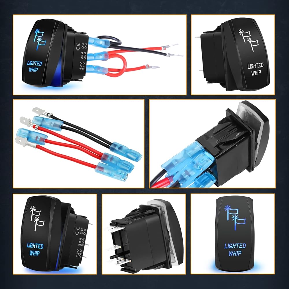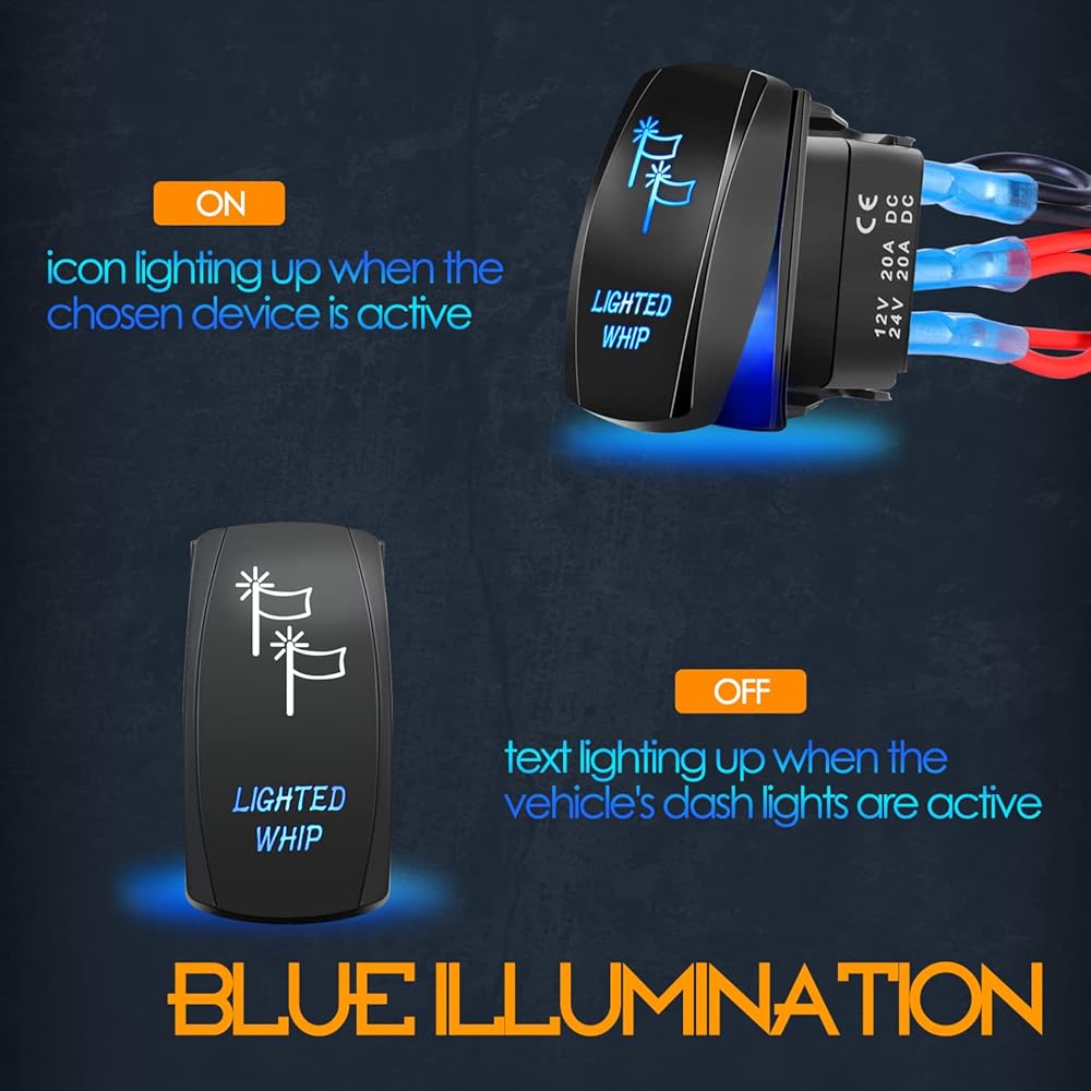 Nirider Light Whip Rocker Switch Blue 5Pin On/Off Light Bar Toggle Switch with Jumper Wires Waterproof Lighted Antenna LED Whip Light Switch for UTV Side by Side RZR ATV Golf Cart Truck
