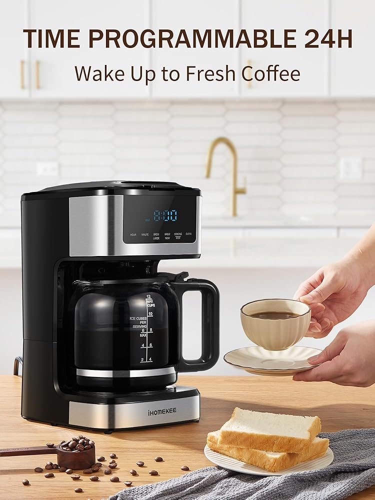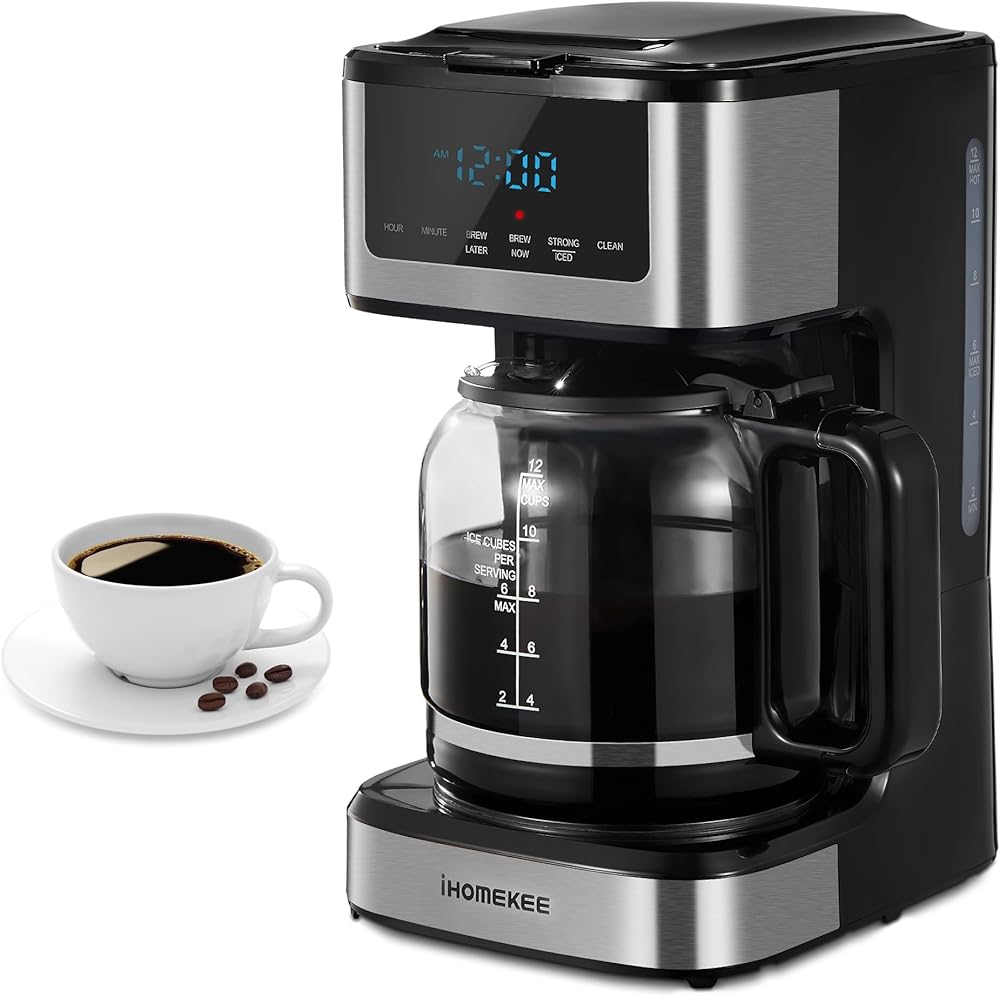 Ihomekee Coffee Maker, Programmable Drip Coffee Maker 12 Cup, Regular & Strong Brew Drip Coffee Machine with Iced Coffee Function for Home and Office, Black & Stainless Steel (Black,Silver)